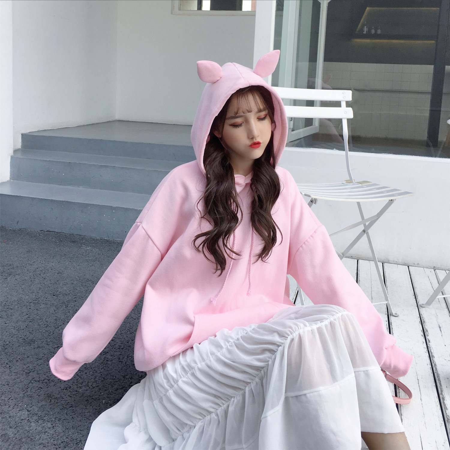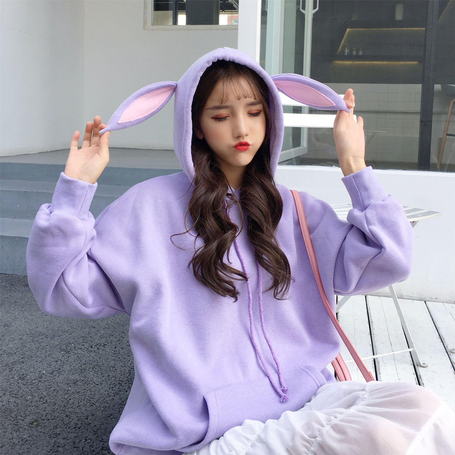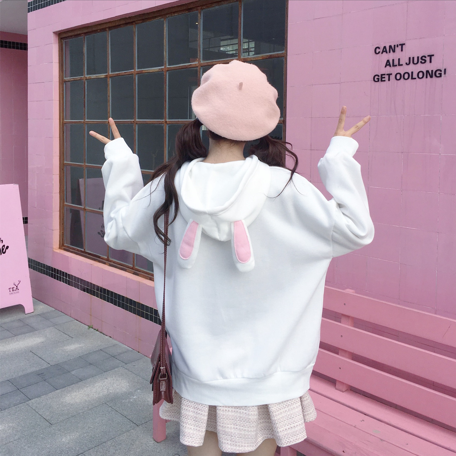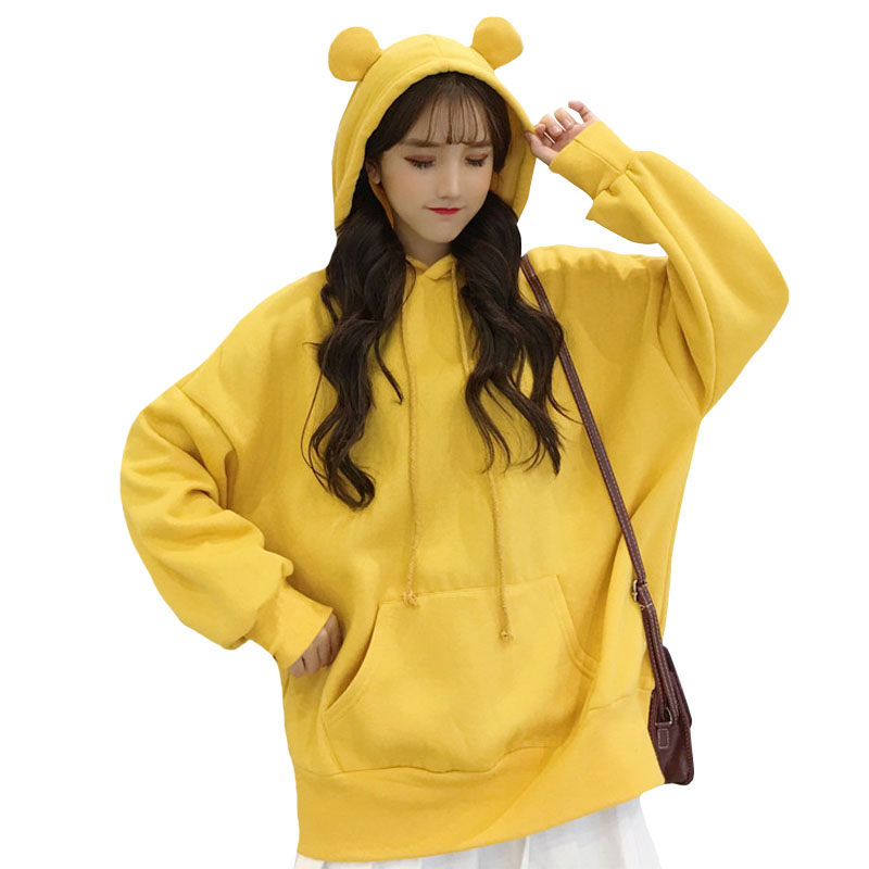 / 秋冬女裝韓版學院風寬松純色兔耳朵加絨加厚連帽超火衛衣上衣外套