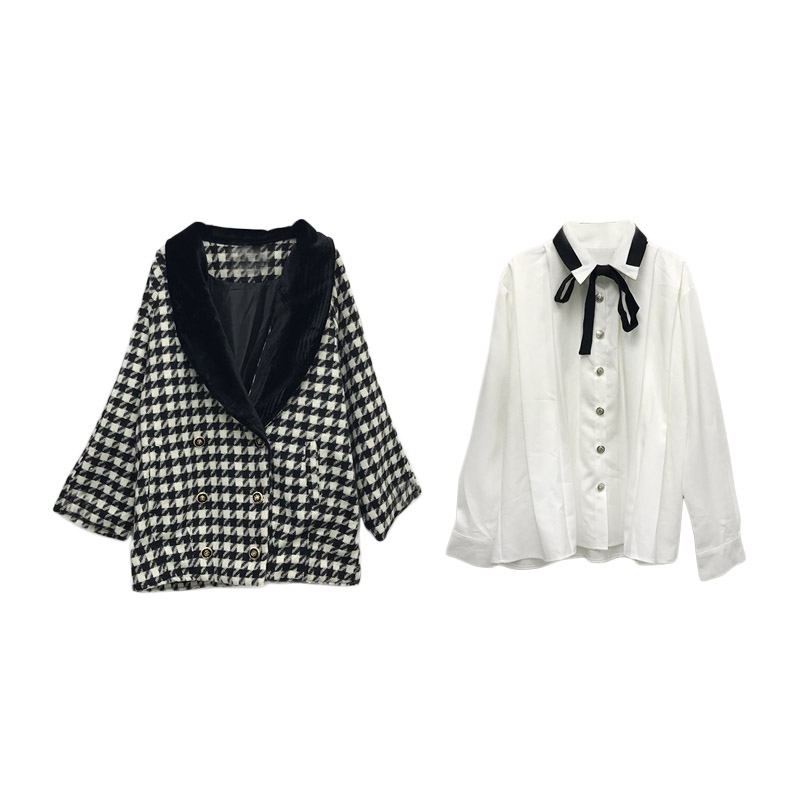 / 毛呢外套女冬季大衣女新款寬松斗篷千鳥格呢子上衣+領帶長袖襯衫