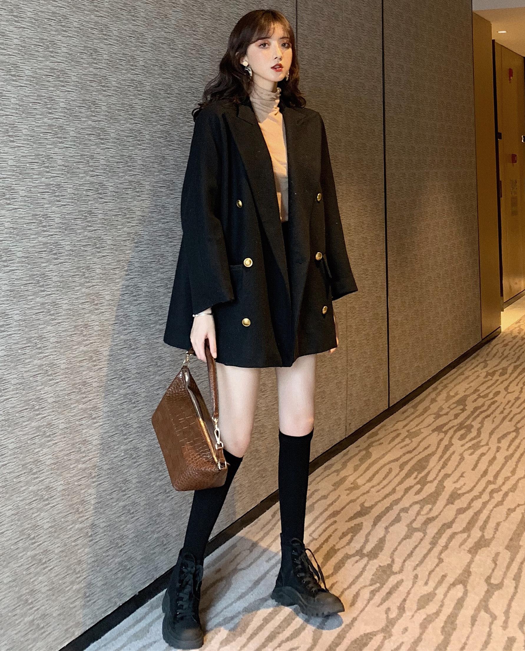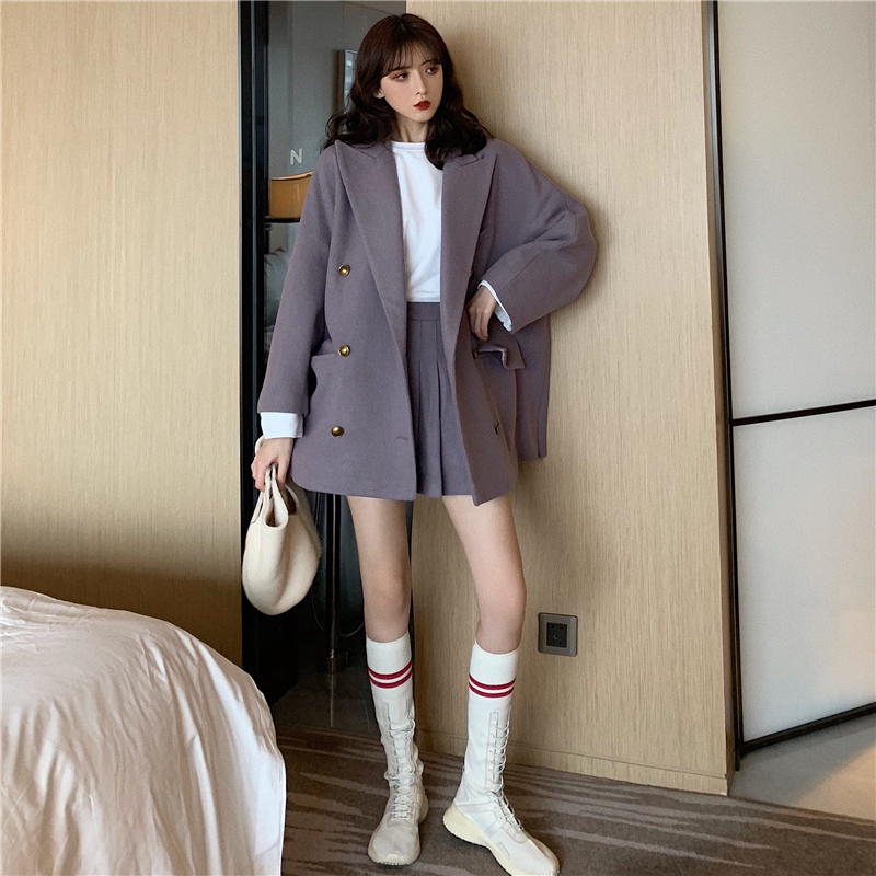 / 秋冬新款雙排扣呢子大衣外套時尚套裝呢子百褶裙褲chic氣質兩件套