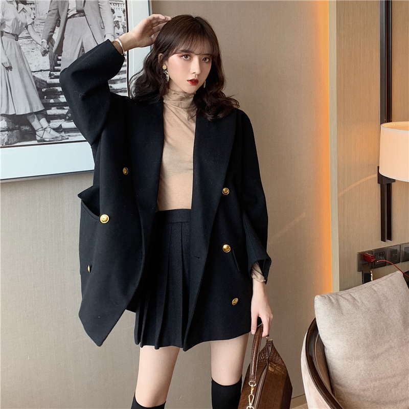 秋冬新款雙排扣呢子大衣外套時尚套裝呢子百褶裙褲chic氣質兩件套