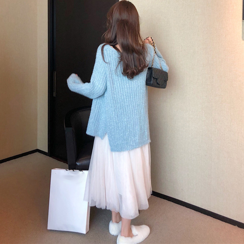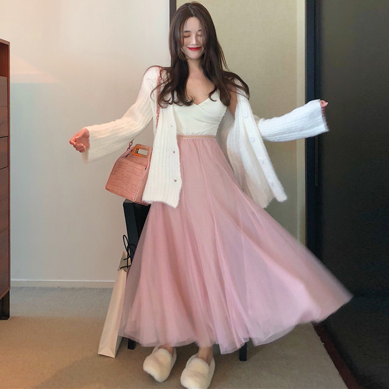 御姐套裝女秋冬新款寬松白色針織毛衣外套高腰顯瘦A字網紗半身裙