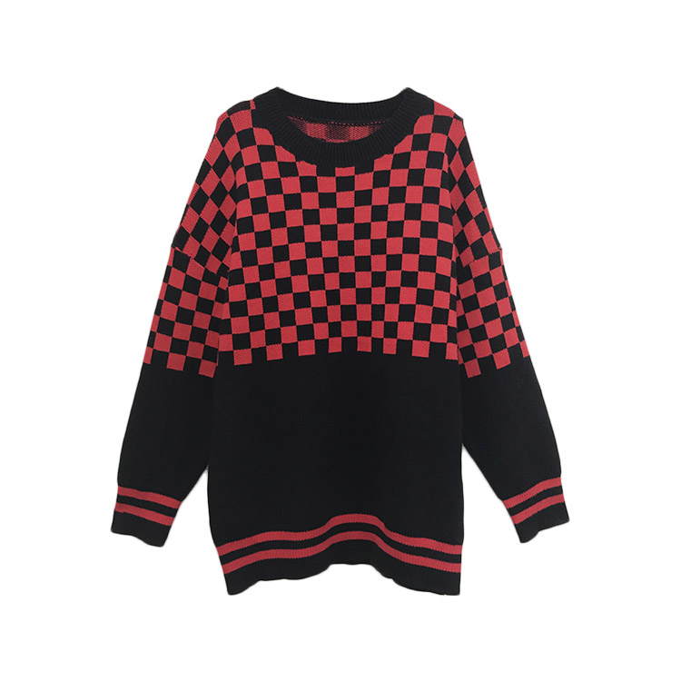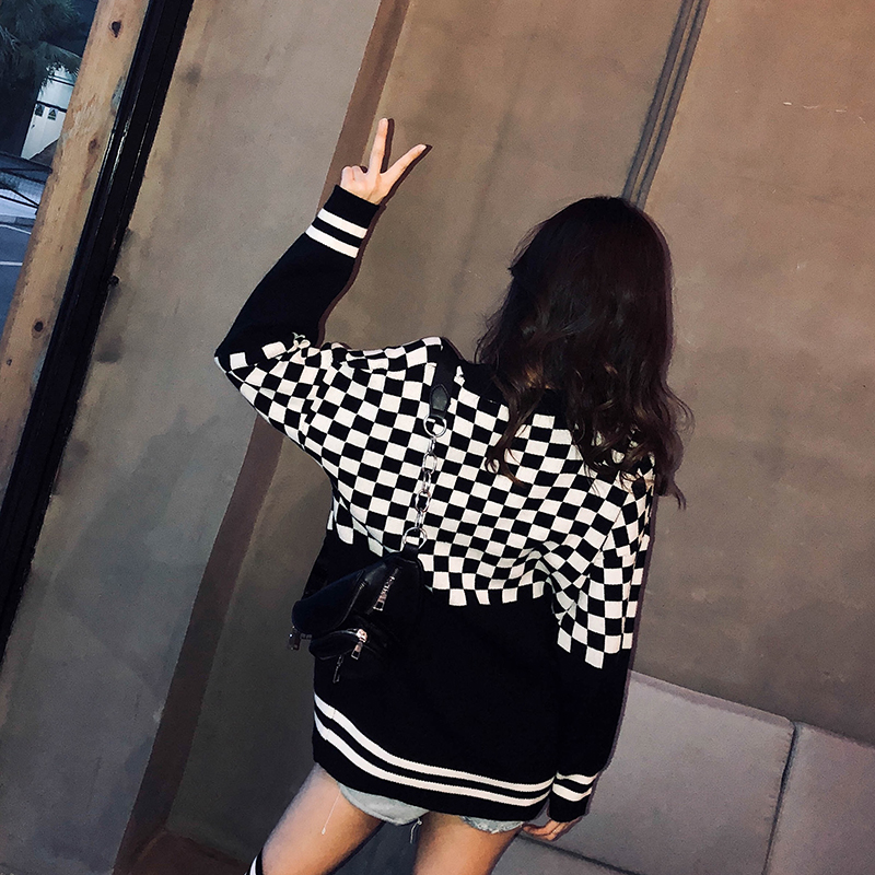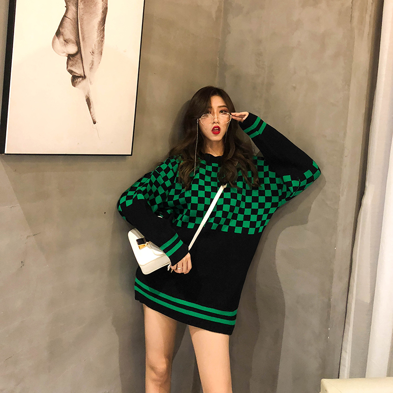 慵懶風網紅毛衣女2018新款韓版寬松撞色網格條紋長袖針織毛線衫潮