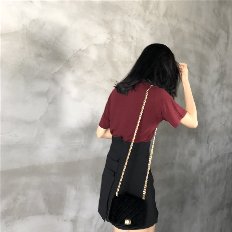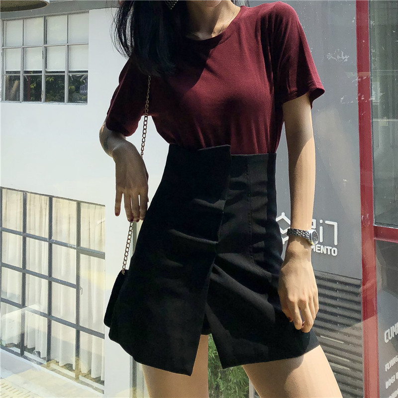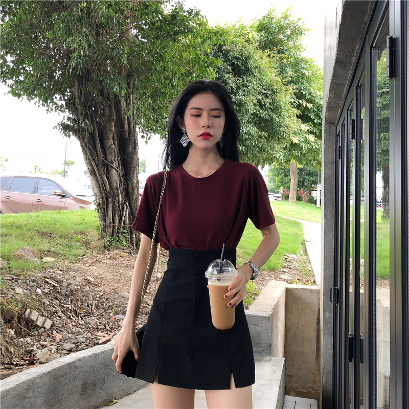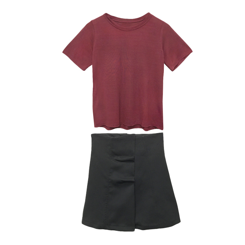 港味氣質套裝酒紅色短袖T恤女+開衩高腰黑色半身裙時髦套裝分開拍