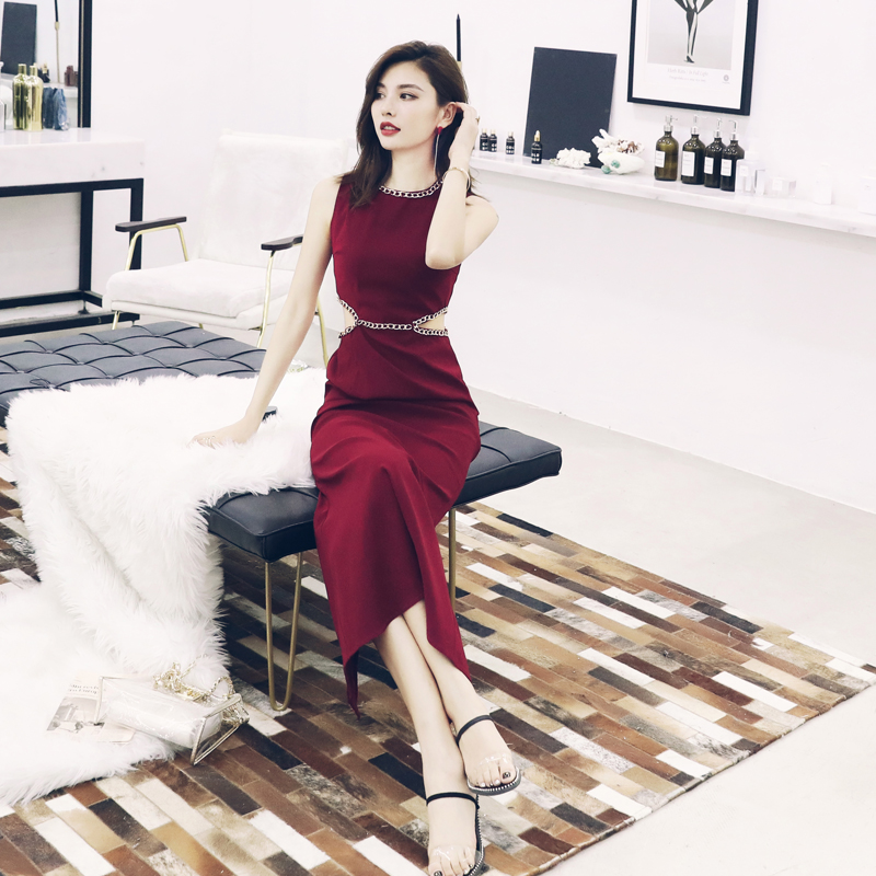 / 2018夏裝新款開叉性感修身顯瘦無袖長款露腰心機連衣裙紅色禮服裙