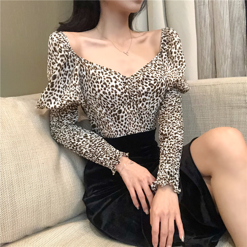 / chic小性感豹紋修身V領打底衫時尚套裝褶皺開叉高腰絨裙兩件套女