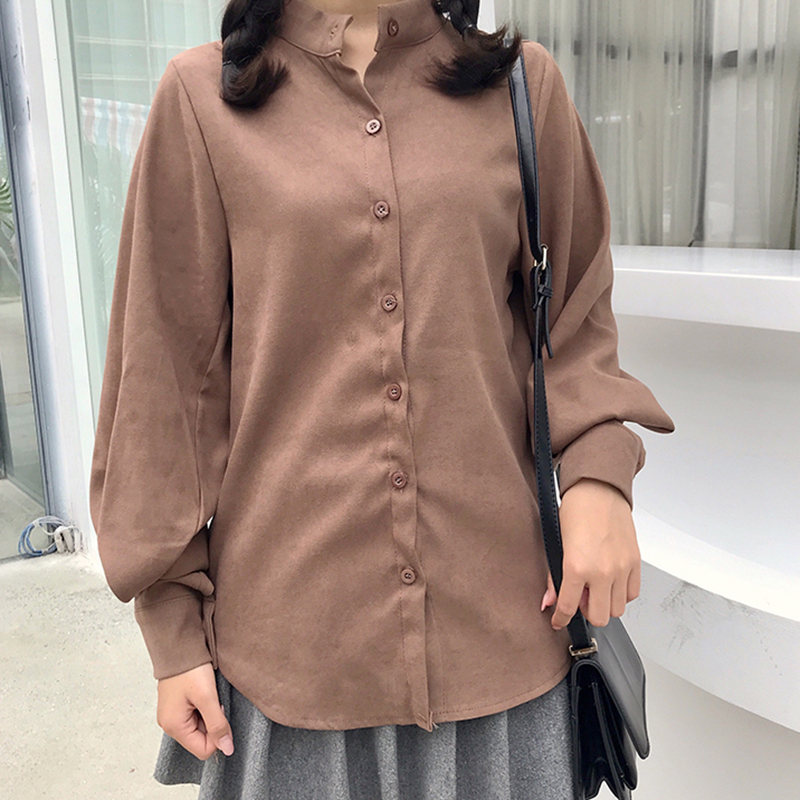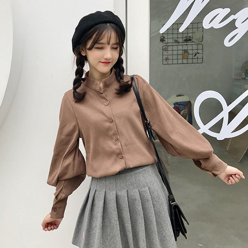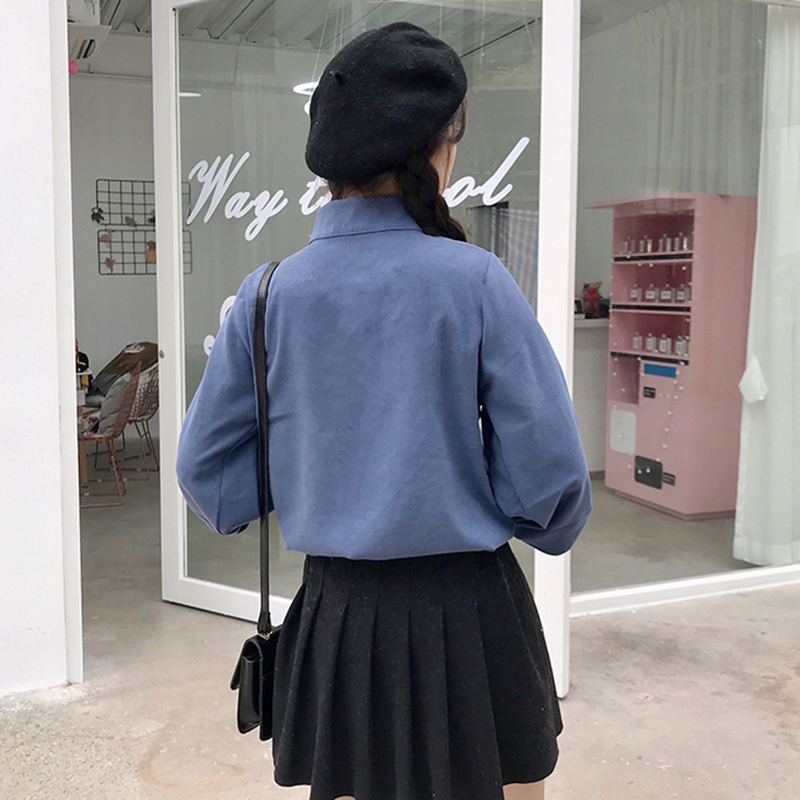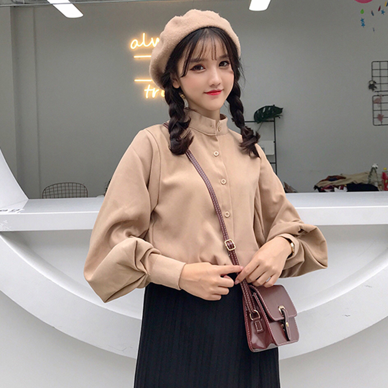 / 藍色襯衫女2018秋裝新款燈籠長袖休閑上衣學生寬松立領單排扣襯衣