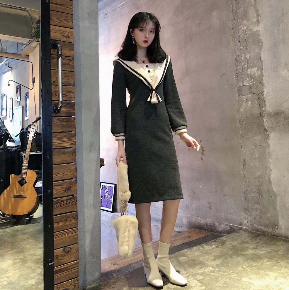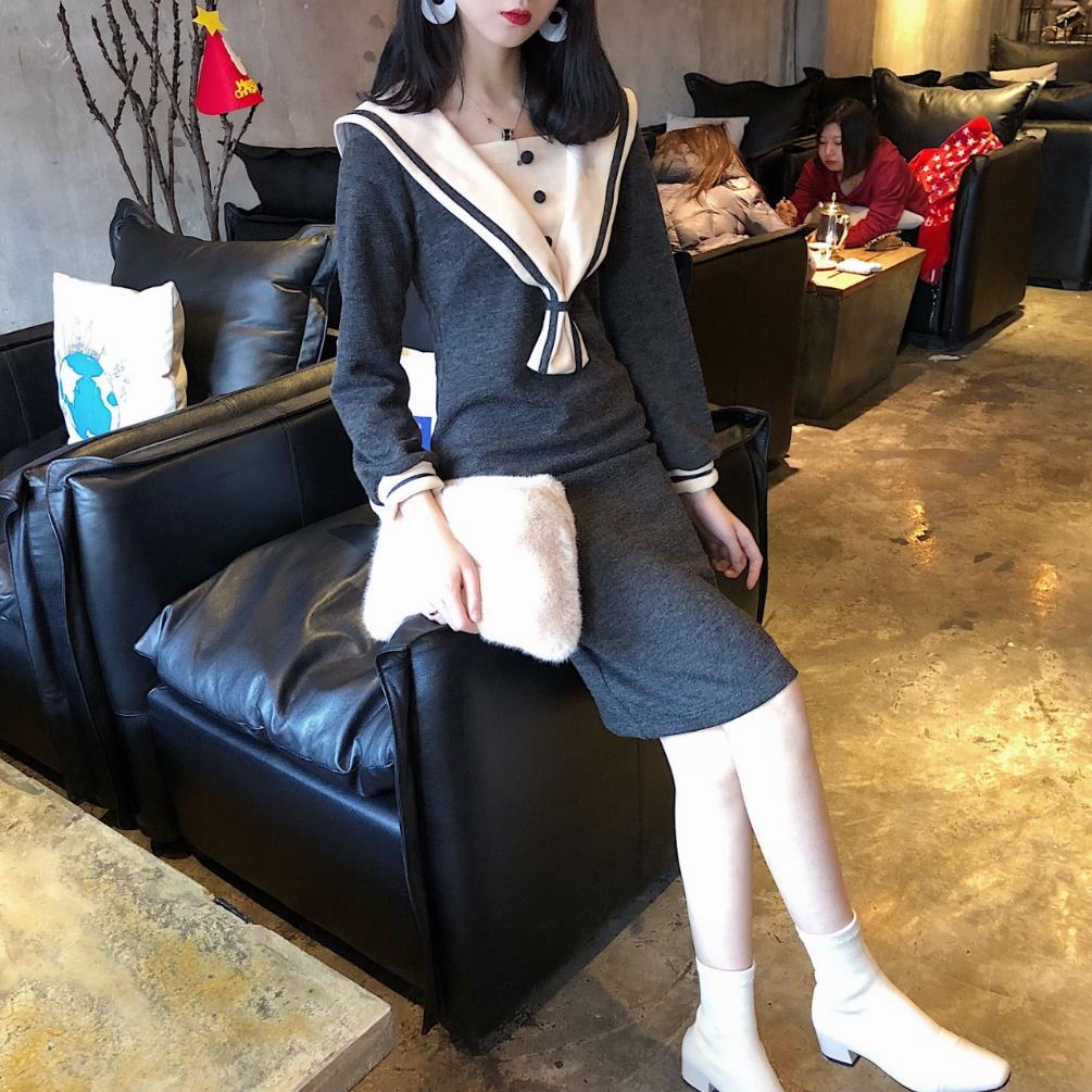 2018韓版秋裝新款時尚中長裙復古chic百搭氣質水手服打底連衣裙女