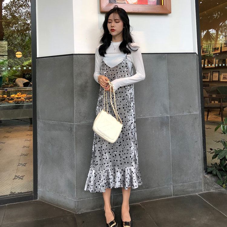 秋裝女2018新款荷葉邊中長款魚尾裙溫柔風波點連衣裙+修身打底T恤