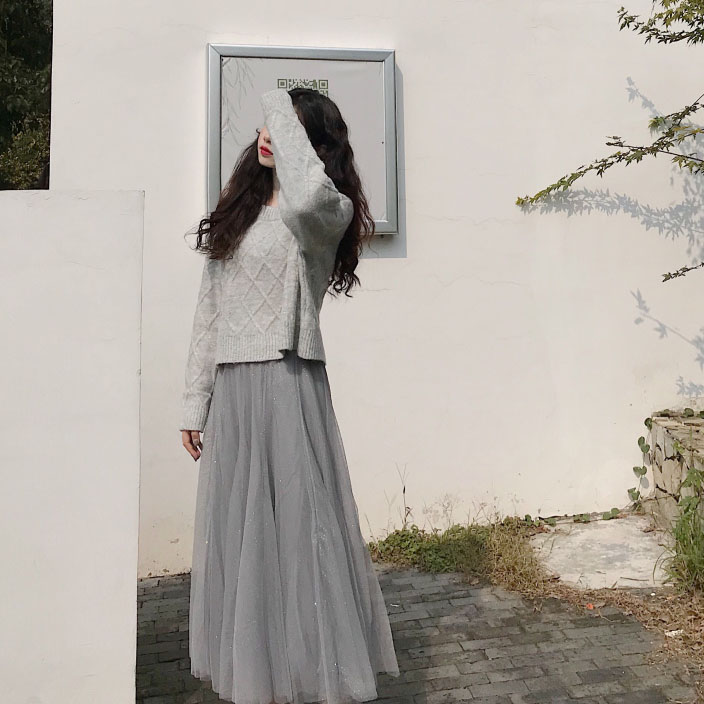 / 2018秋冬季新款寬松圓領套頭菱形針織毛衣+高腰中長款星星網紗裙
