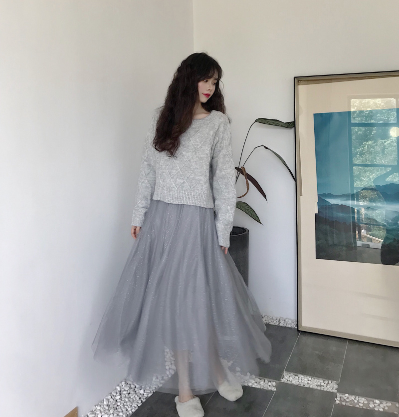 2018秋冬季新款寬松圓領套頭菱形針織毛衣+高腰中長款星星網紗裙