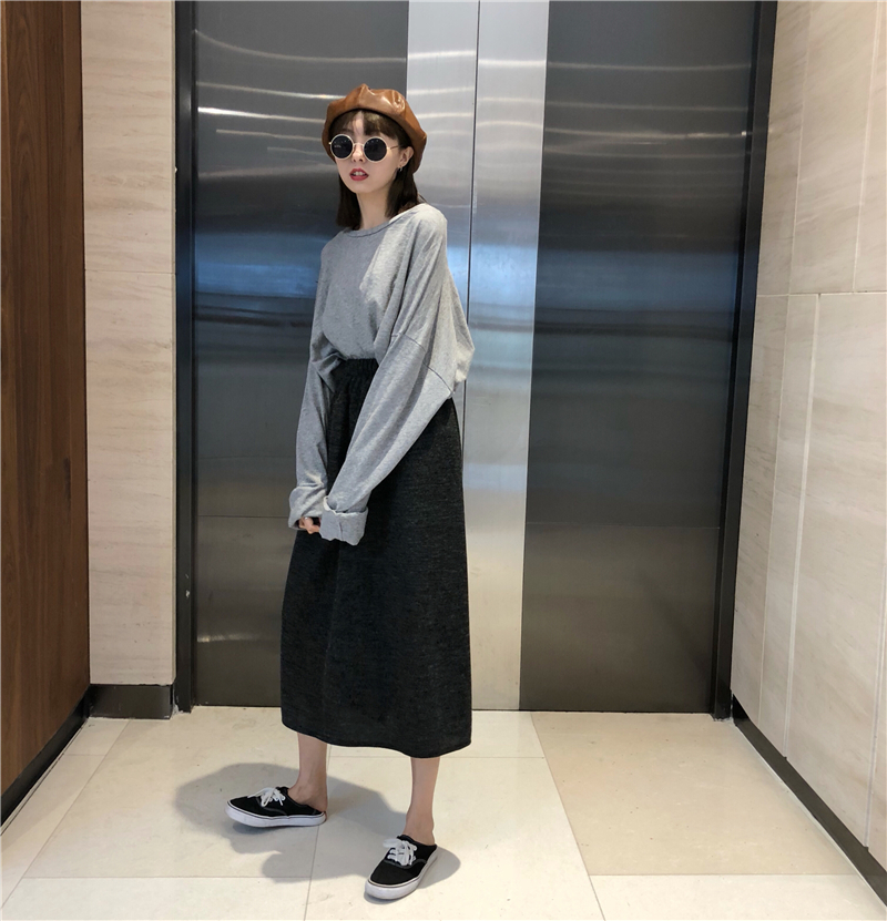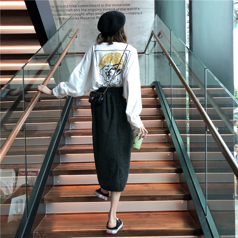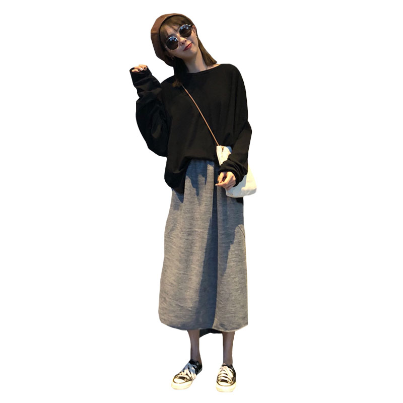 / 韓版時尚休閑套裝秋季女裝原宿風中長款長袖t恤+開叉半身裙兩件套