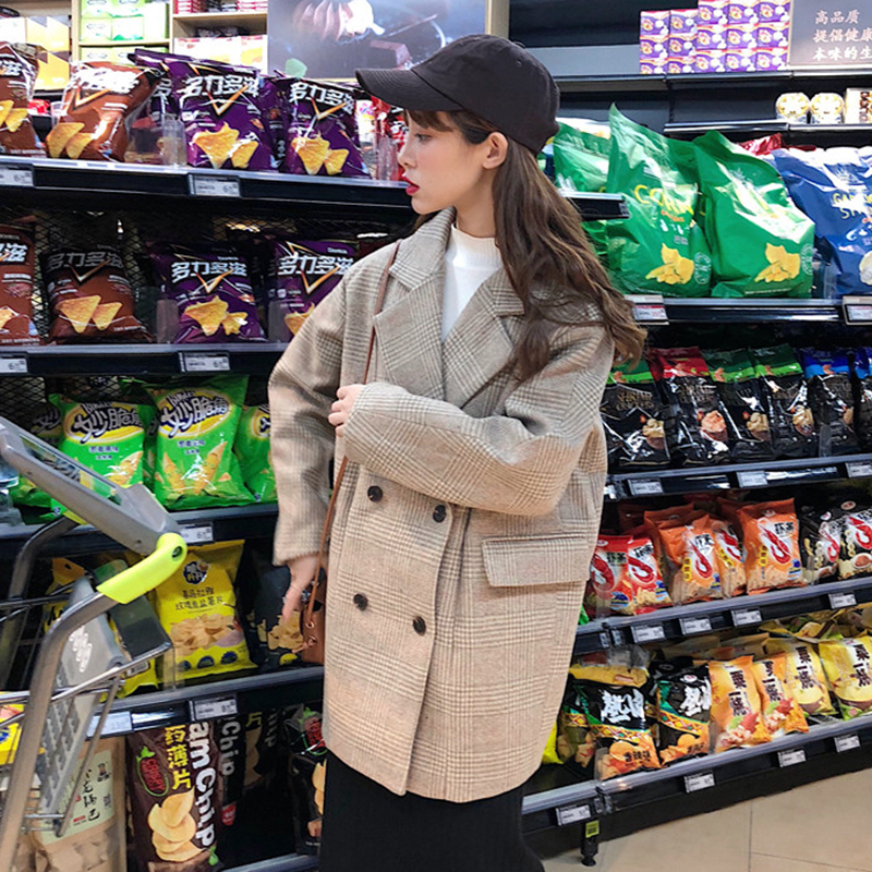 / 秋裝女2018新款復古格子中長款毛呢外套寬松長袖上衣時尚休閑西裝