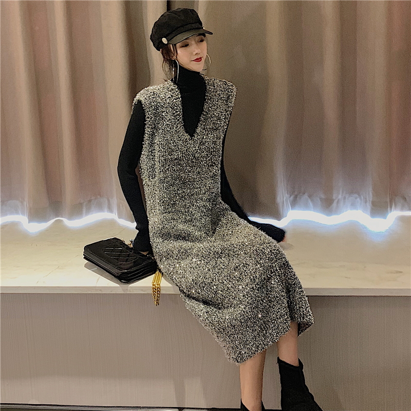 2018秋冬新款閃閃亮絲無袖V領套頭背心裙純色修身打底衫時尚套裝