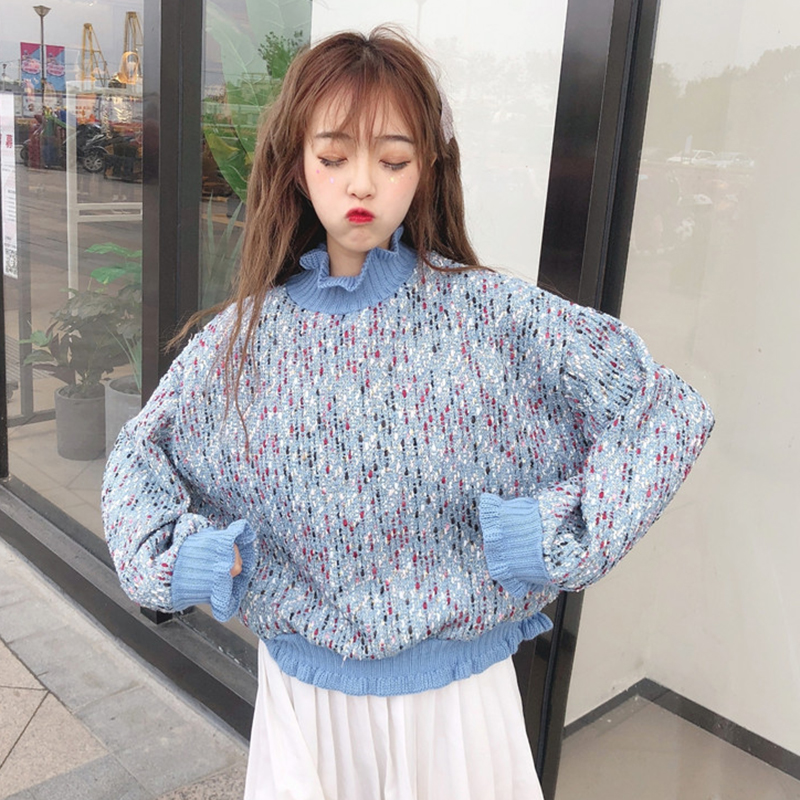 氣質木耳邊拼接燈籠袖衛衣女秋冬裝2018新款寬松套頭粗花毛呢外套