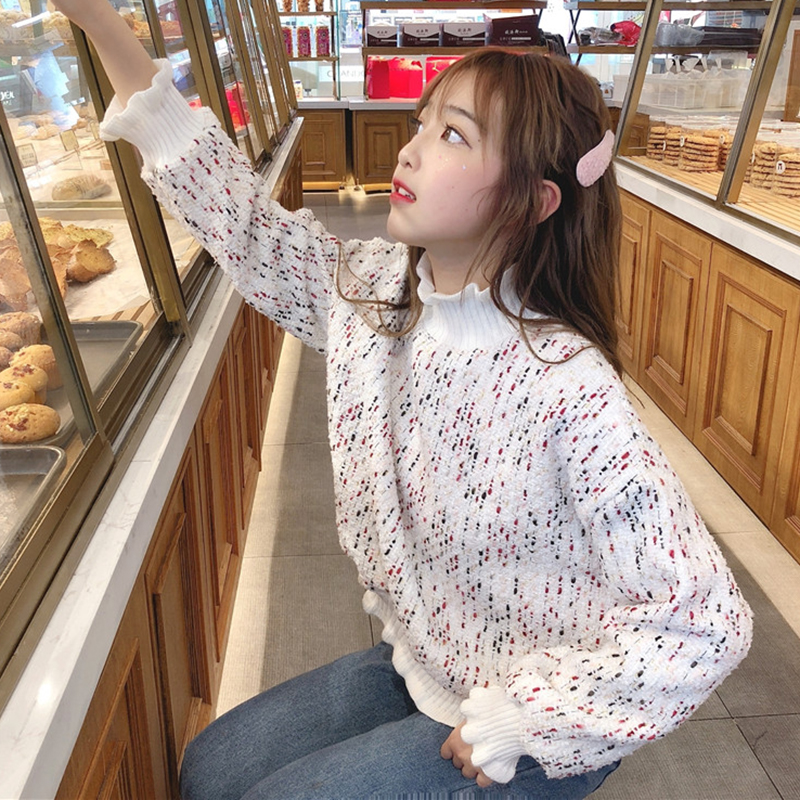 / 氣質木耳邊拼接燈籠袖衛衣女秋冬裝2018新款寬松套頭粗花毛呢外套