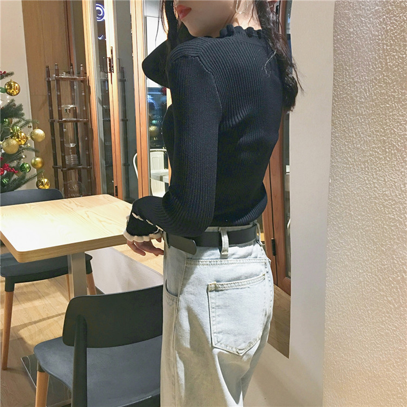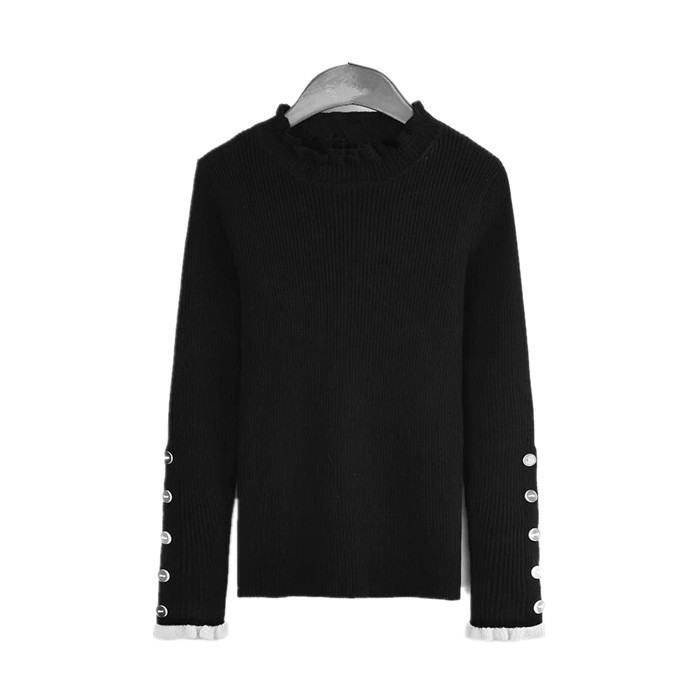 秋裝新款半高領木耳邊修身顯瘦毛衣針織打底衫女韓版排扣長袖上衣