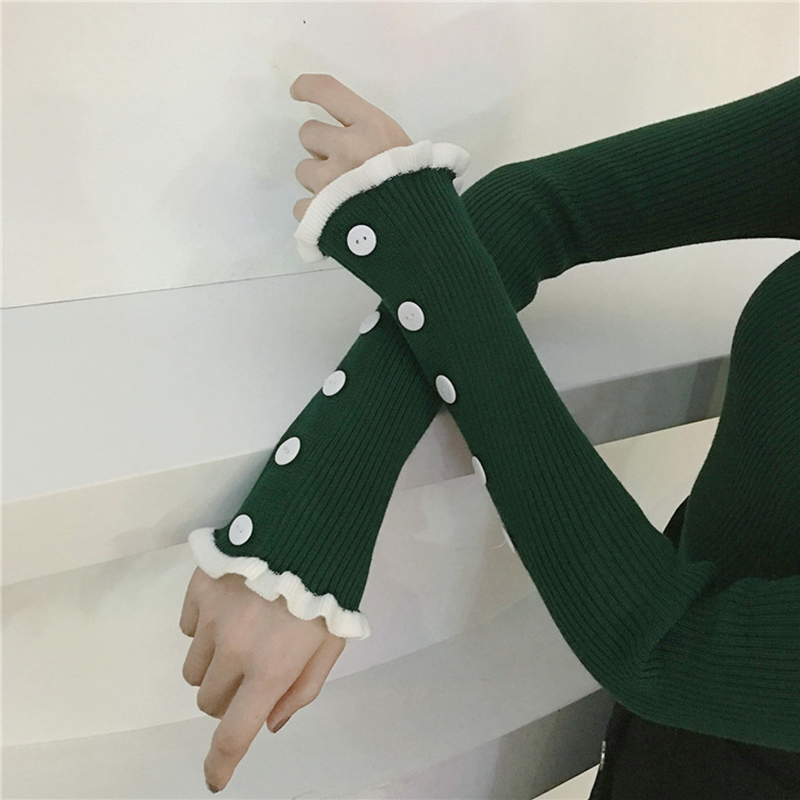 / 秋裝新款半高領木耳邊修身顯瘦毛衣針織打底衫女韓版排扣長袖上衣
