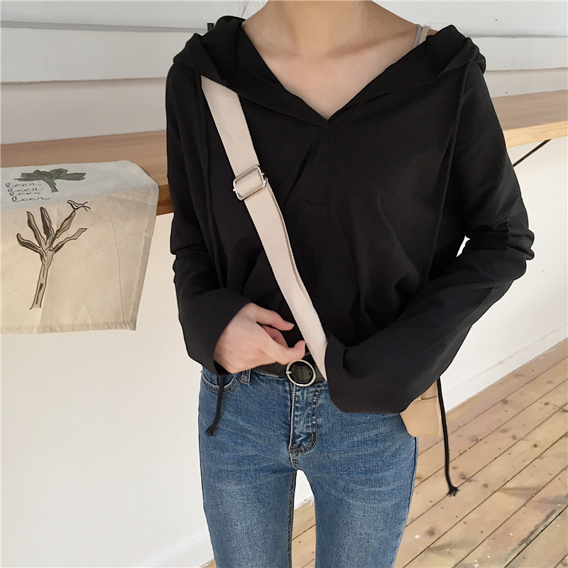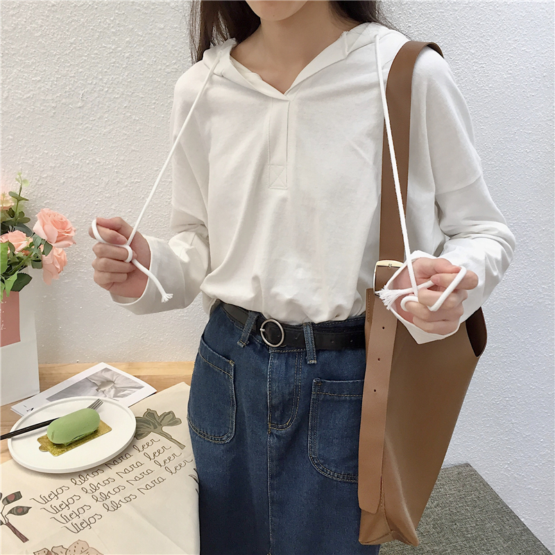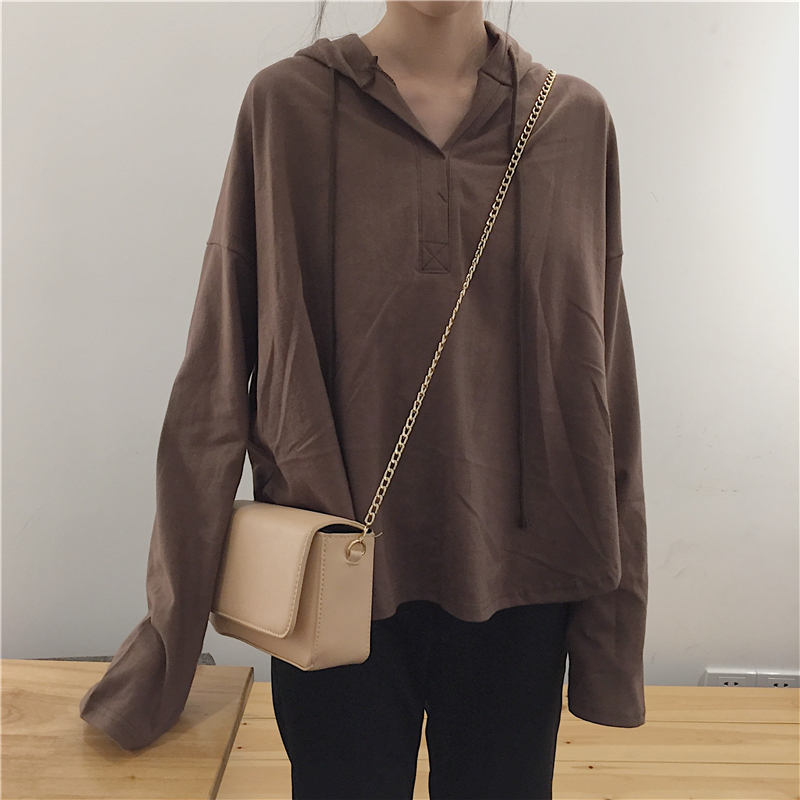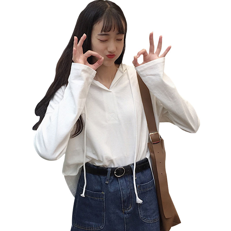 秋裝女裝韓版純色連帽抽繩長袖套頭衛衣寬松百搭休閑T恤上衣外套