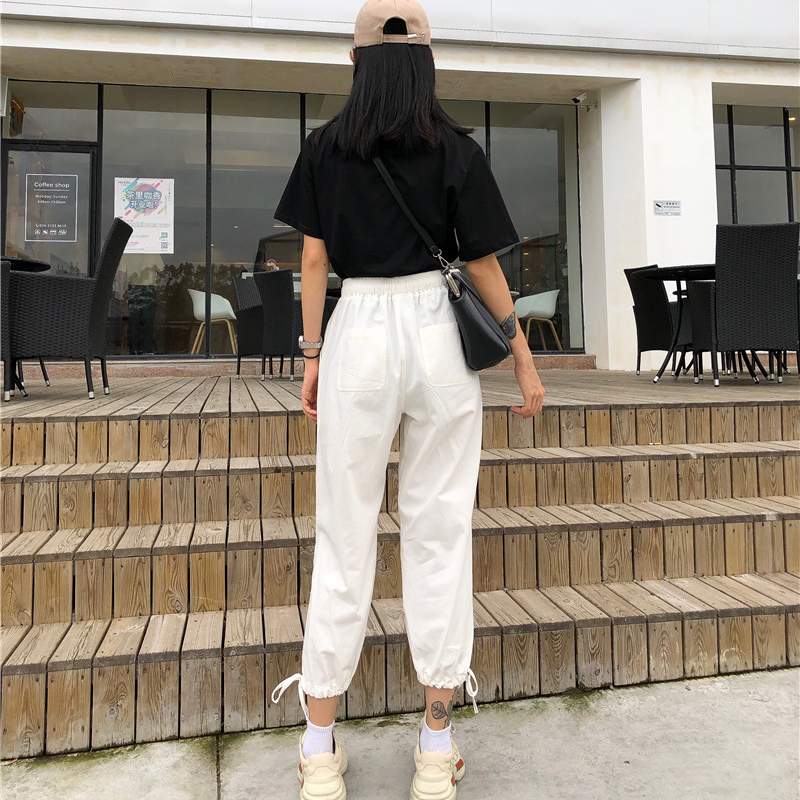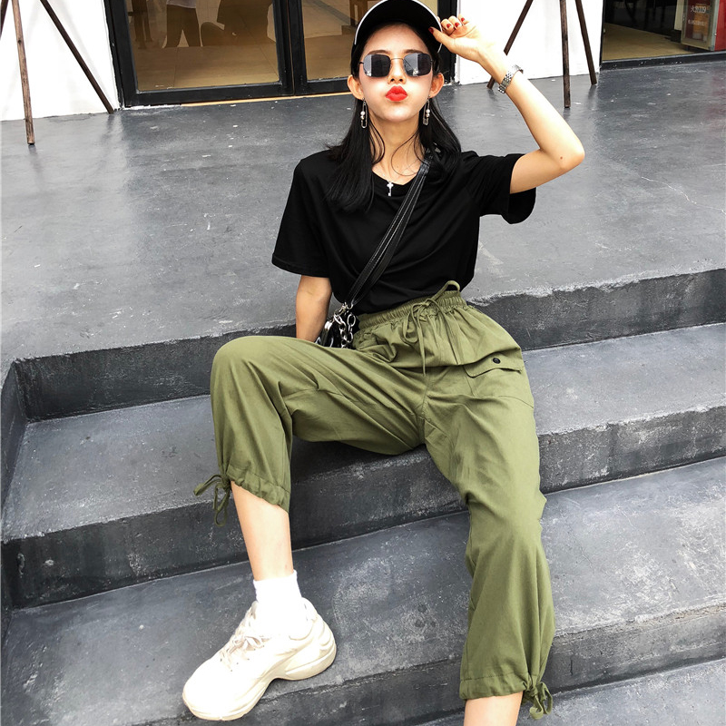 兩件套女夏季新款女裝韓版純色短袖黑T+工裝束腳九分褲闊腿休閑褲