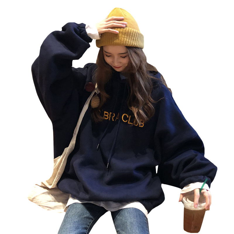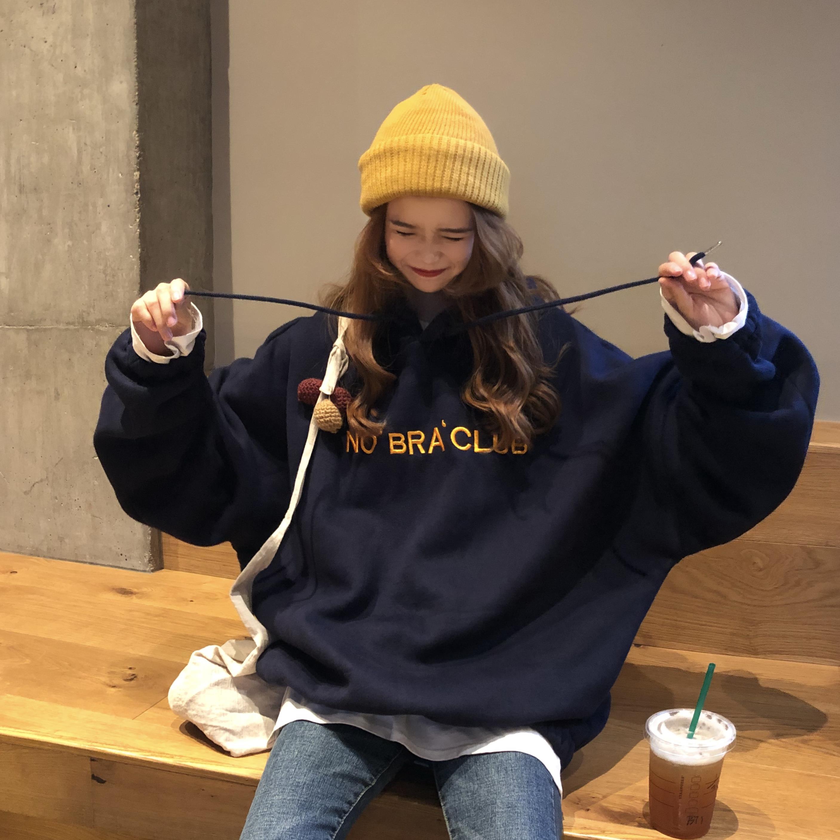 / 秋冬女裝韓版中長款慵懶風字母刺繡寬松連帽加絨加厚衛衣上衣外套