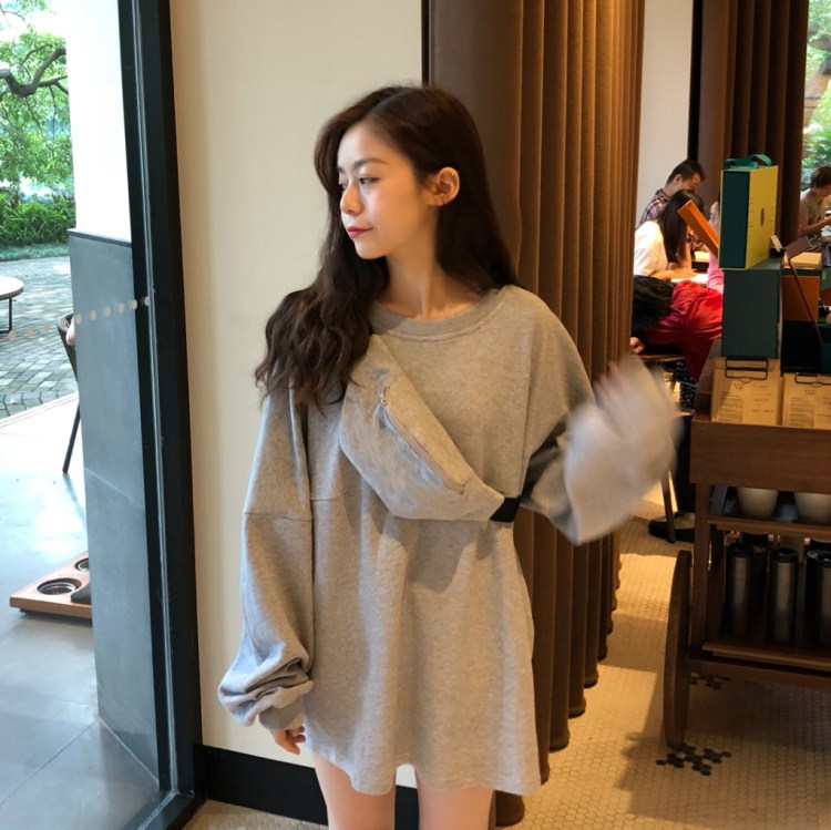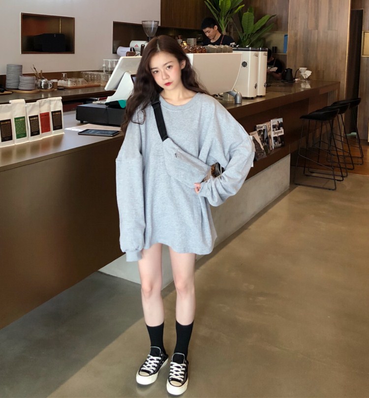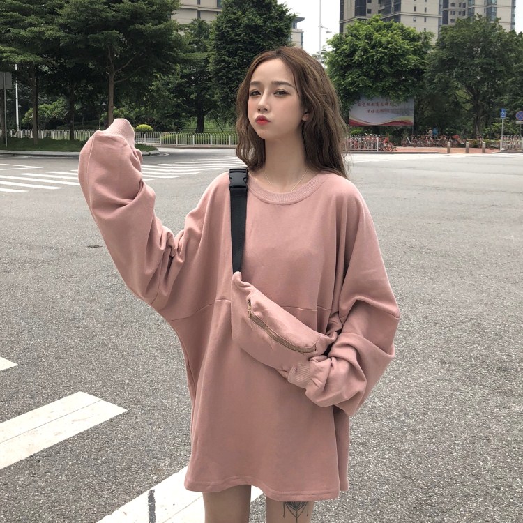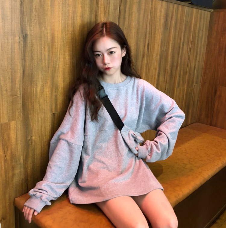 韓風寬松百搭小清新慵懶風時尚學生chic長袖薄款純色衛衣女配包包