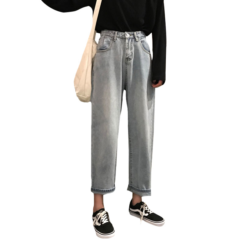 / 秋季韓版水洗做舊淺色牛仔褲寬松高腰顯瘦直筒褲闊腿褲長褲學生女