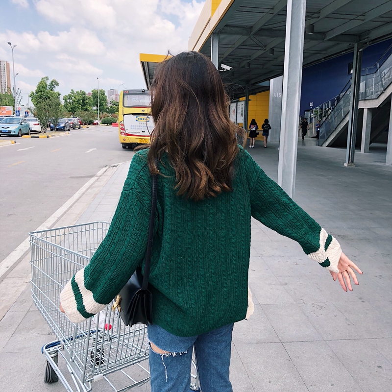 / 秋冬女裝韓版寬松V領拼色慵懶風毛衣學生套頭長袖針織衫上衣外套