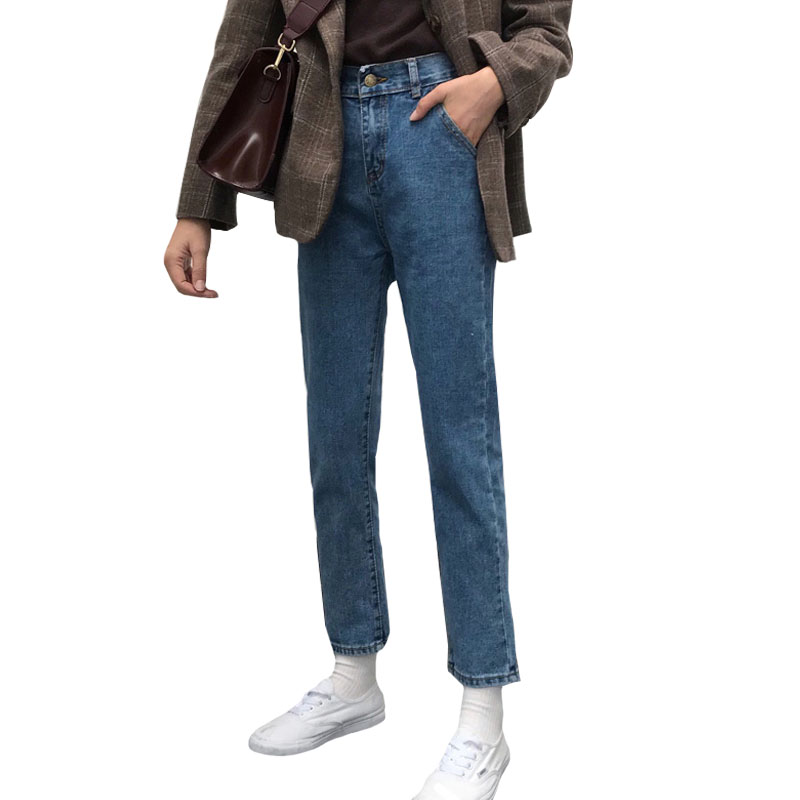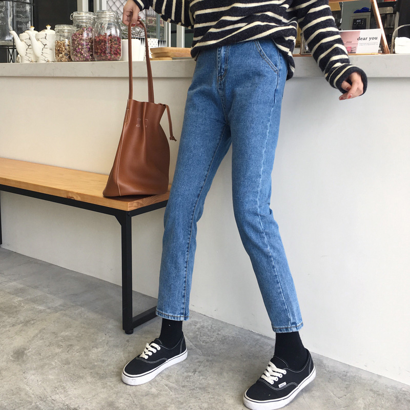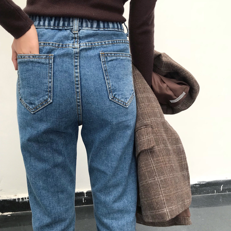 / 秋季女裝韓版寬松松緊腰牛仔褲學生高腰顯瘦直筒褲九分褲小腳褲潮
