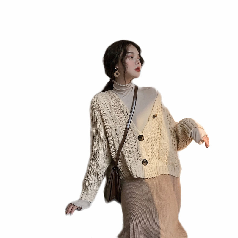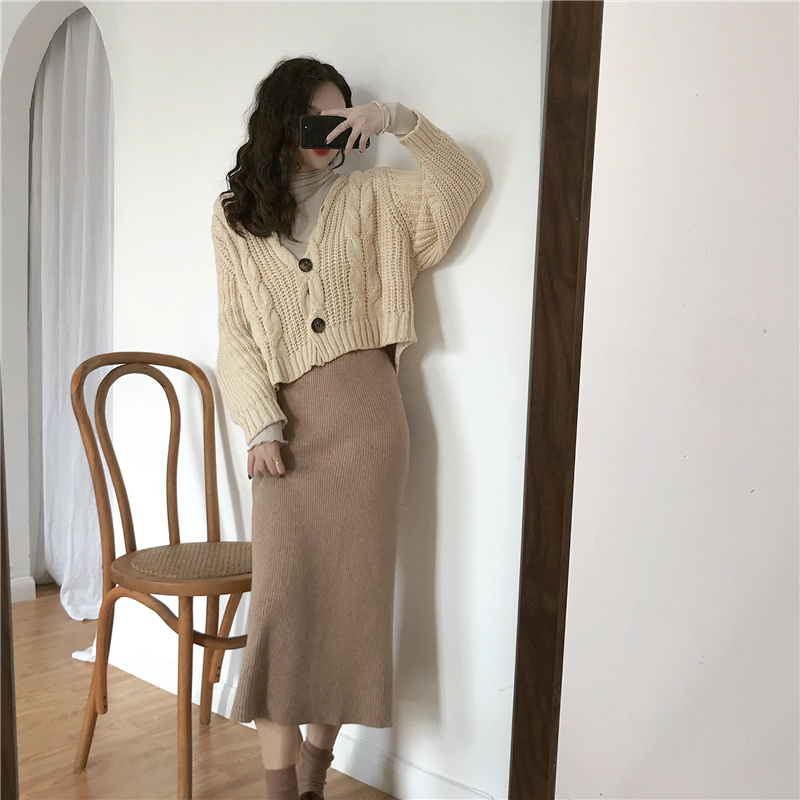 時尚慵懶復古針織麻花開衫+百搭高領打底+中長款包臀針織裙三件套
