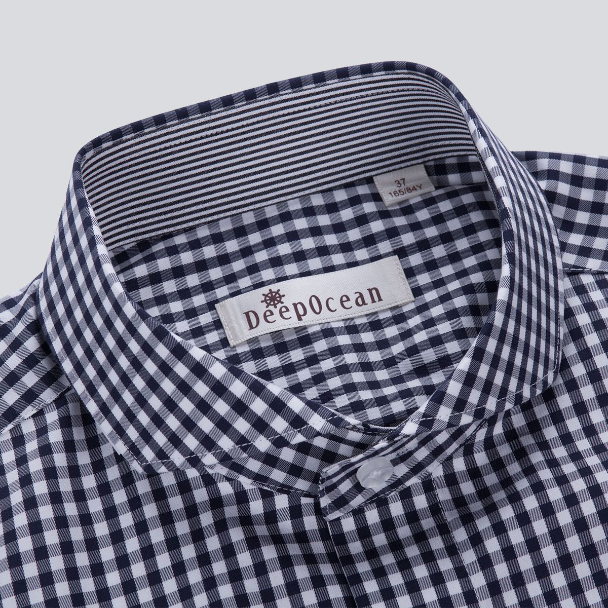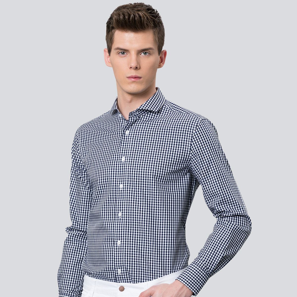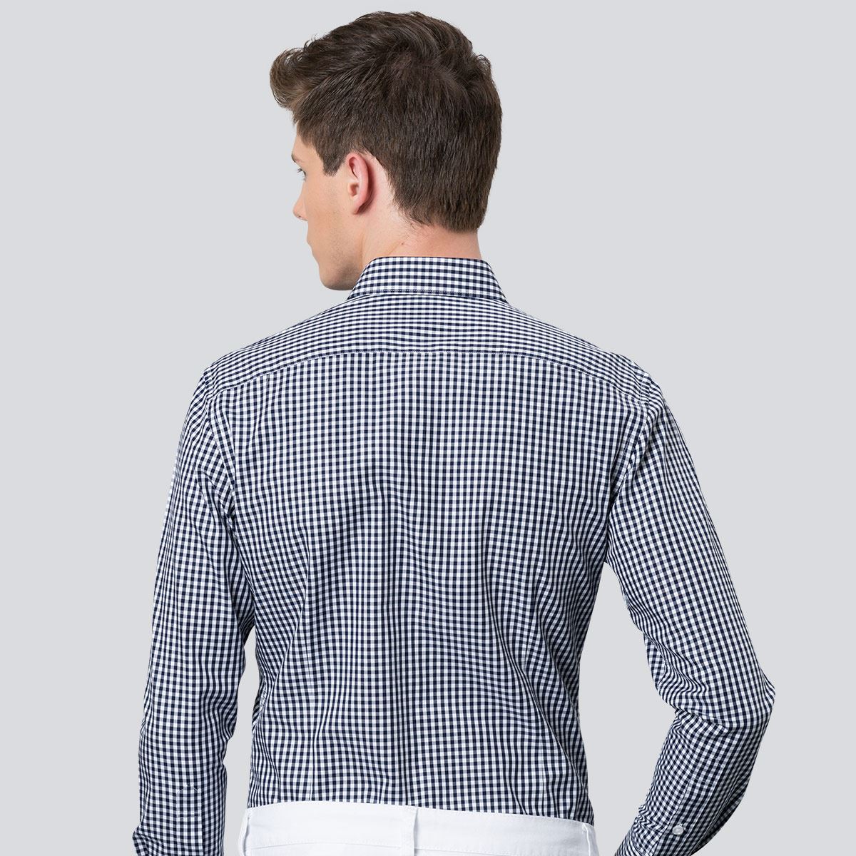 / 深海藍白小格子襯衫長袖男士休閑黑白色格子襯衣韓版修身純棉免燙