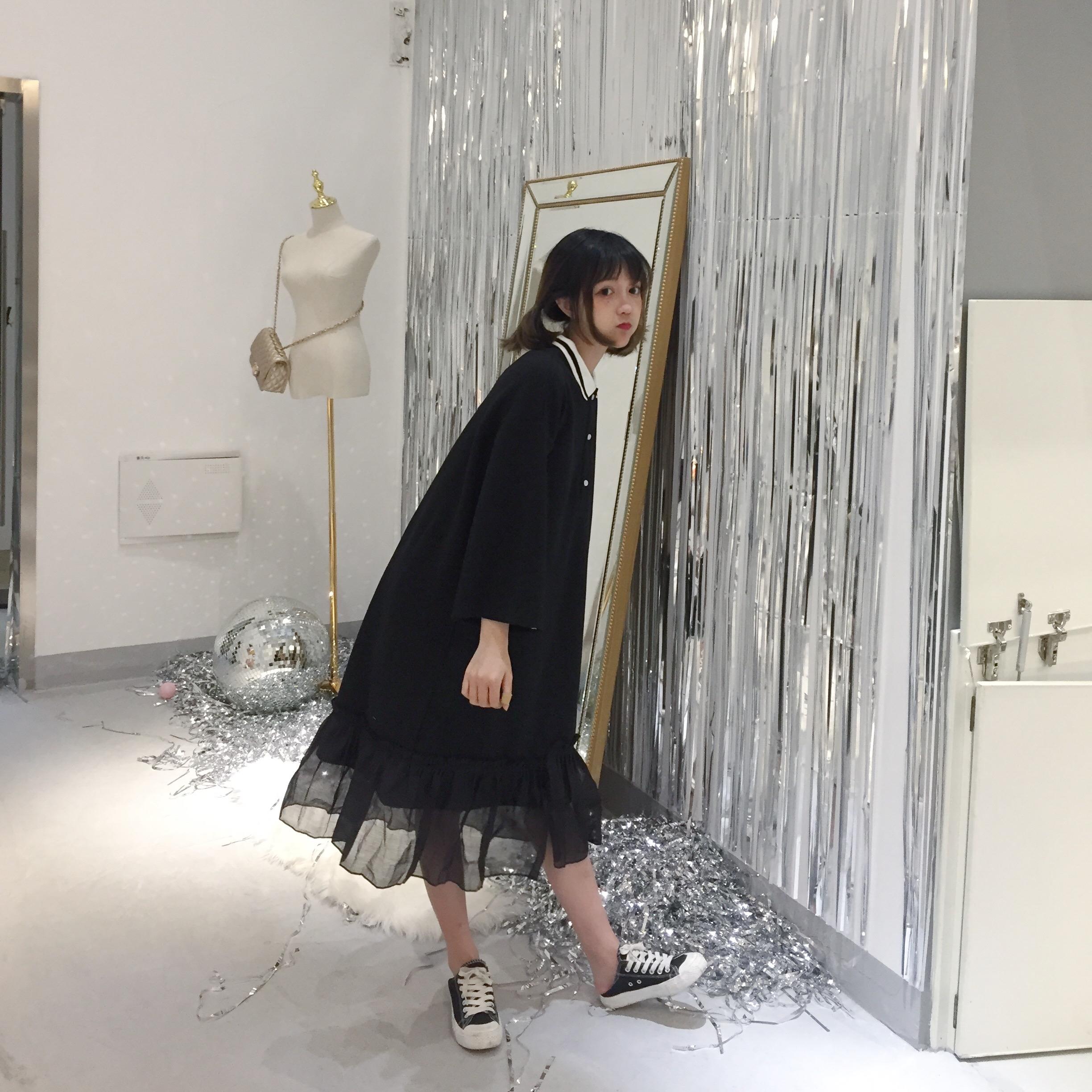夏季新款女裝學院風條紋領寬松顯瘦雪紡裙擺拼接荷葉邊學生連衣裙