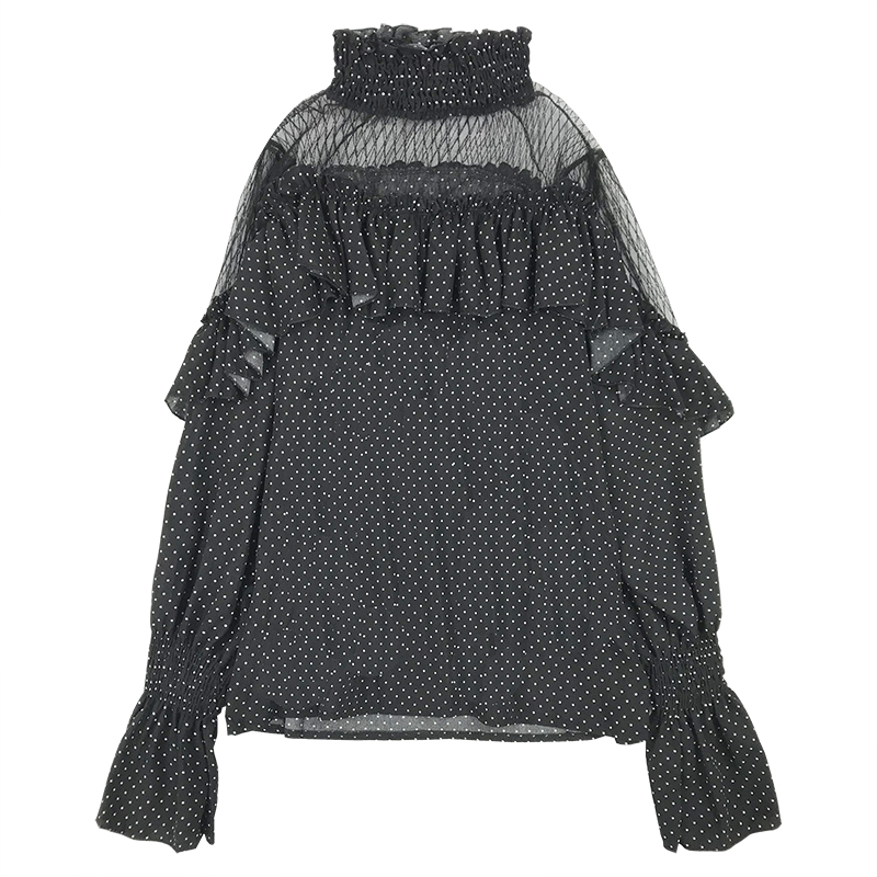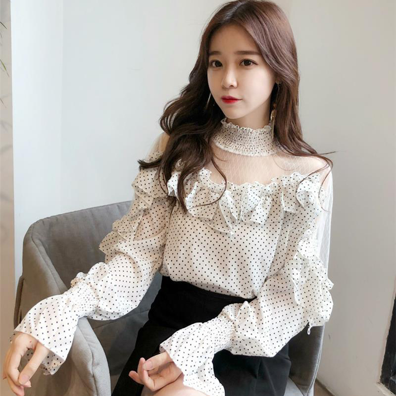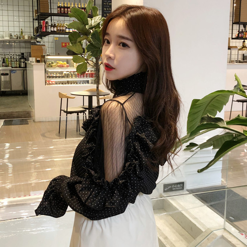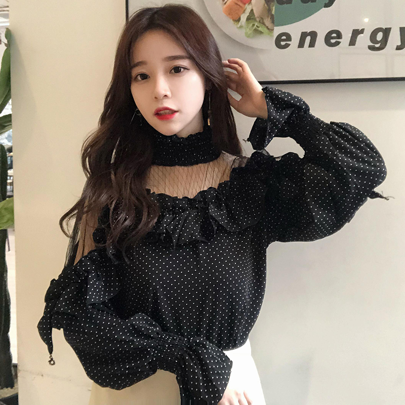 / 襯衫女初秋新款女裝韓版高領網紗拼接上衣荷葉邊喇叭袖波點襯衣潮