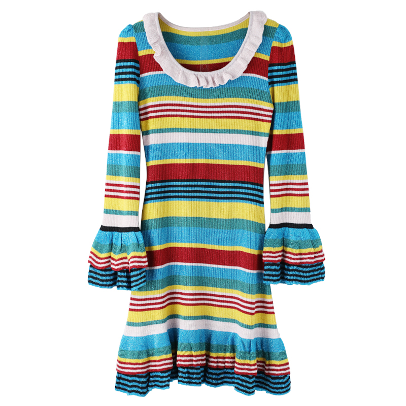 / 2018秋新款修身圓領長袖撞色條紋針織連衣裙修身a字裙子潮