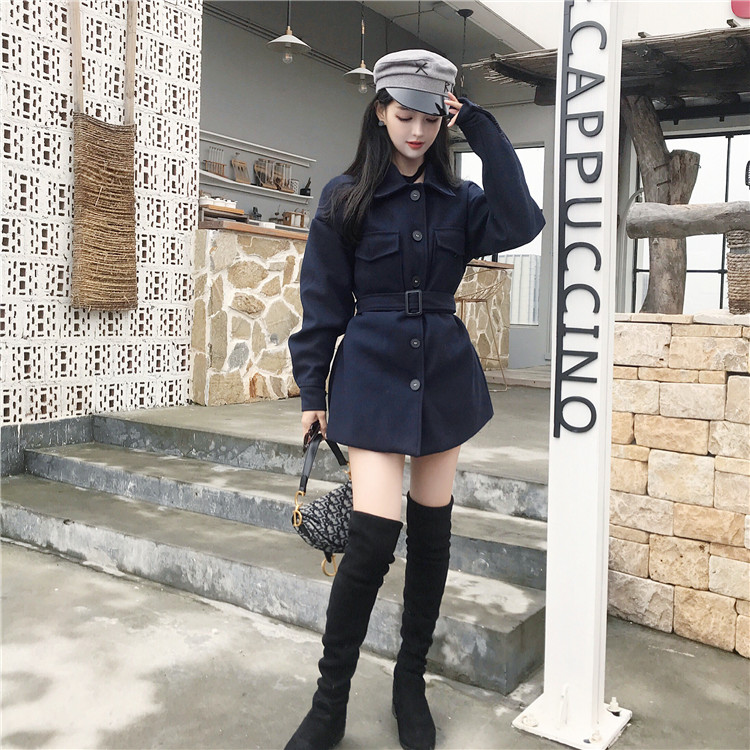 復古翻領單排扣綁帶收腰中長款毛呢外套女秋冬2018新款韓版大衣女