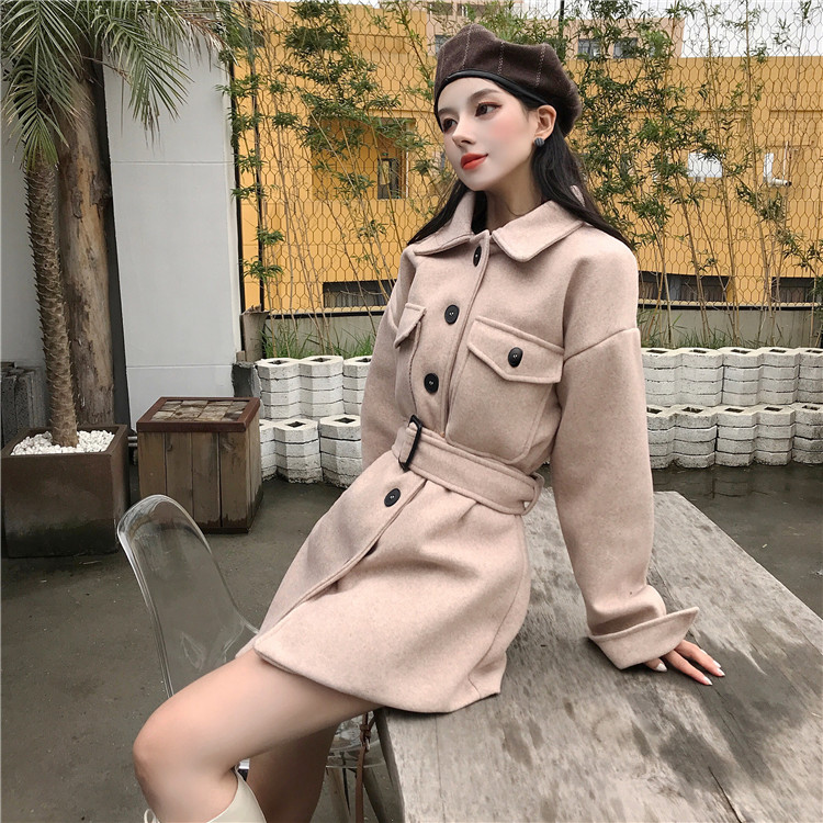 / 復古翻領單排扣綁帶收腰中長款毛呢外套女秋冬2018新款韓版大衣女