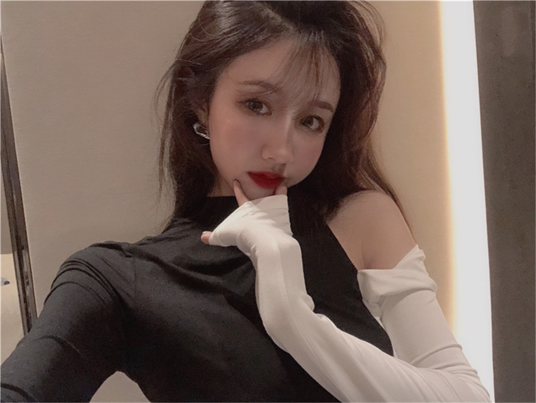 chic早秋新款韓版百搭時尚小心機黑白拼接打底T恤露肩設計上衣女