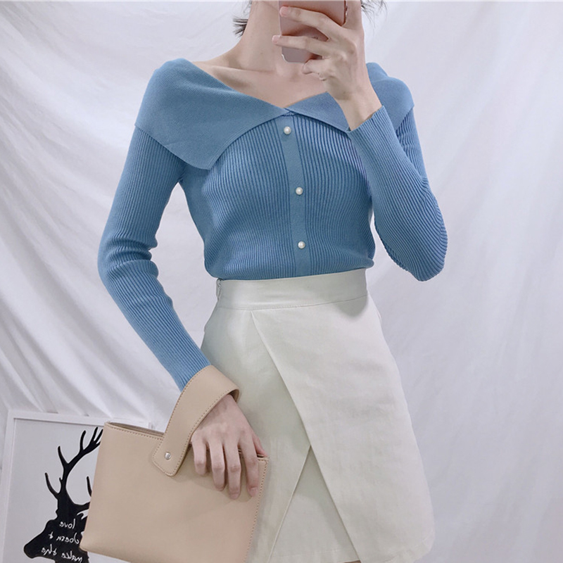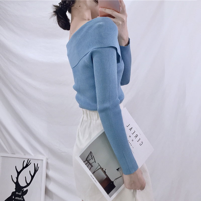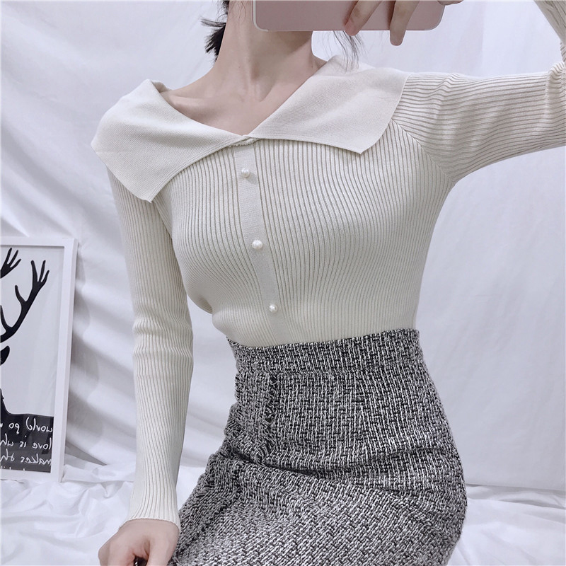 / 秋季新款修身娃娃領針織打底衫女裝韓版顯瘦黑色套頭毛衣長袖上衣