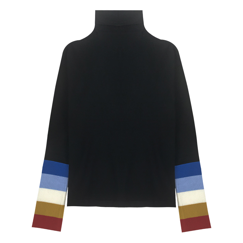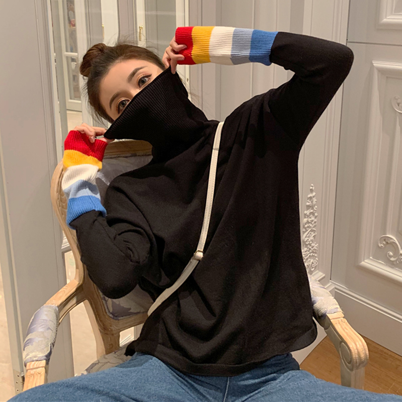 / 針織外套女秋冬裝2018新款高領打底衫彩虹條紋長袖寬松套頭上衣潮