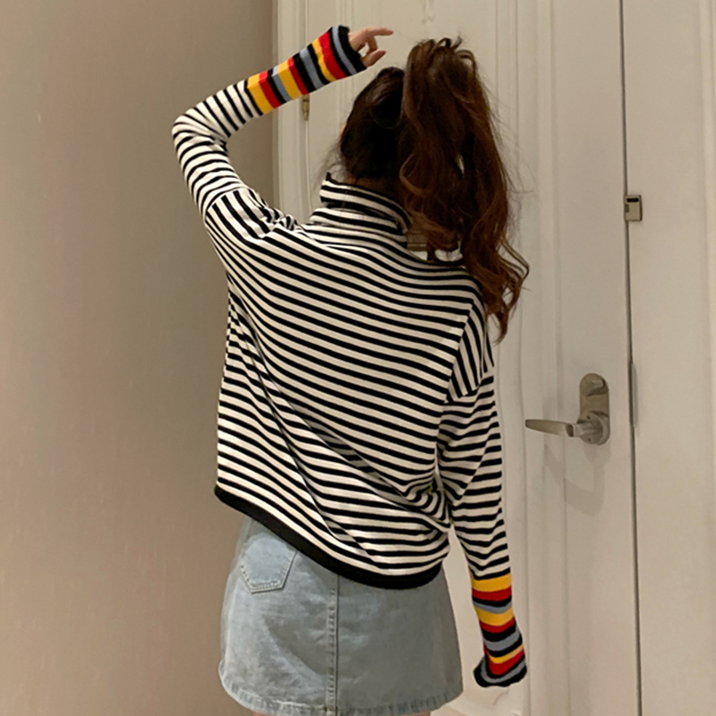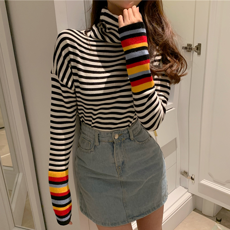 針織外套女秋冬裝2018新款高領打底衫彩虹條紋長袖寬松套頭上衣潮