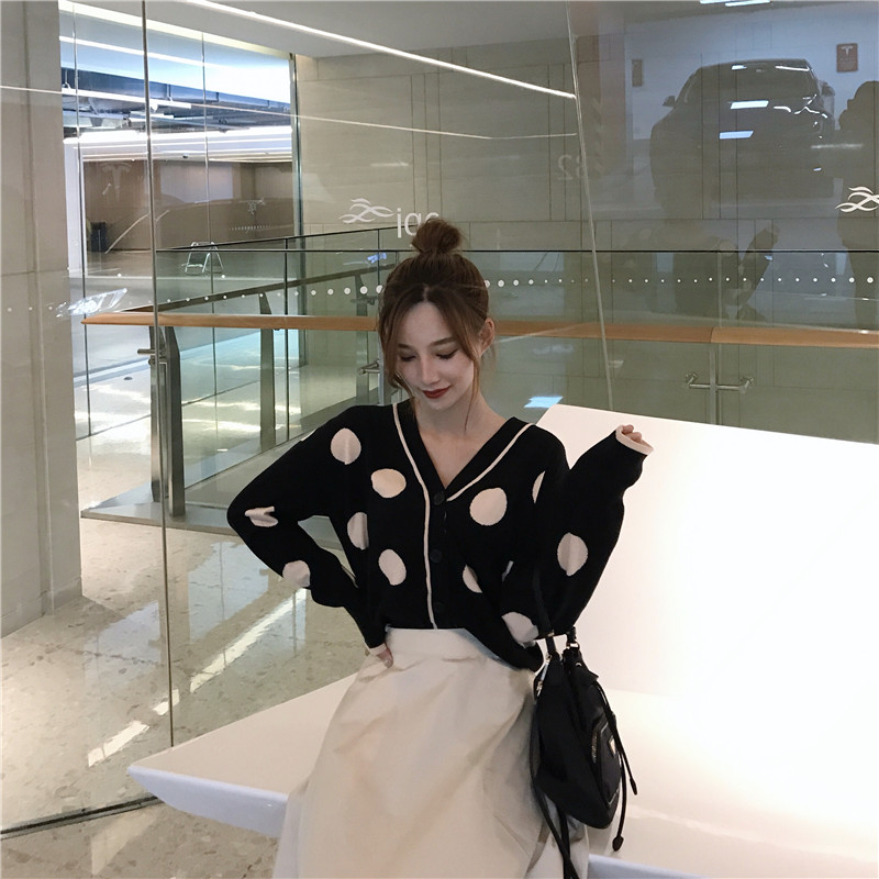 / 韓版女神套裝秋冬大波點V領針織開衫毛衣+高腰半身裙A字裙兩件套