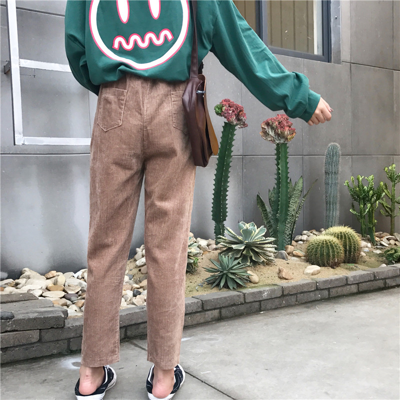秋冬韓版松緊腰燈芯絨褲子高腰寬松哈倫褲休閑褲直筒褲長褲學生女