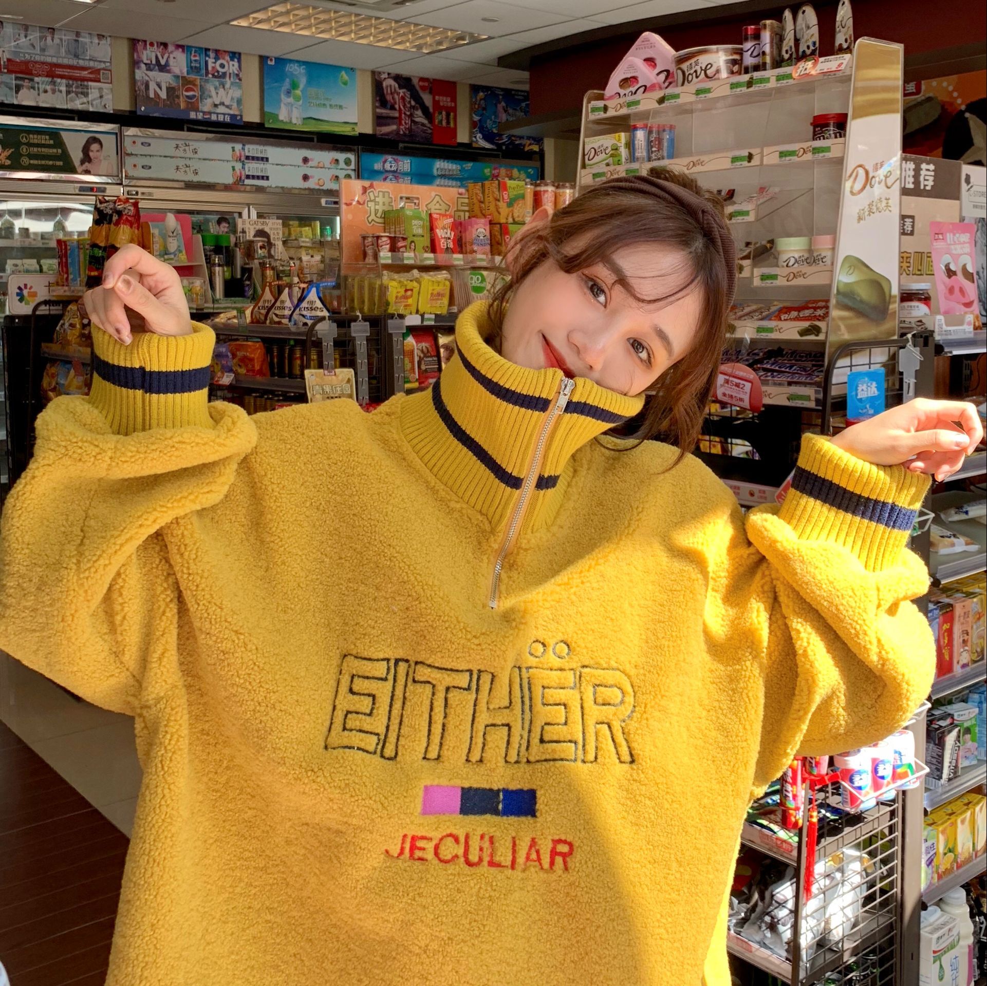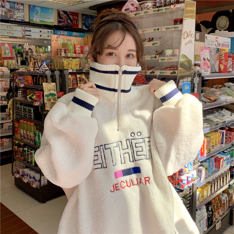寬松顯瘦羊羔毛加厚保暖套頭衛衣女2018新款復古韓版高領字母絨衫