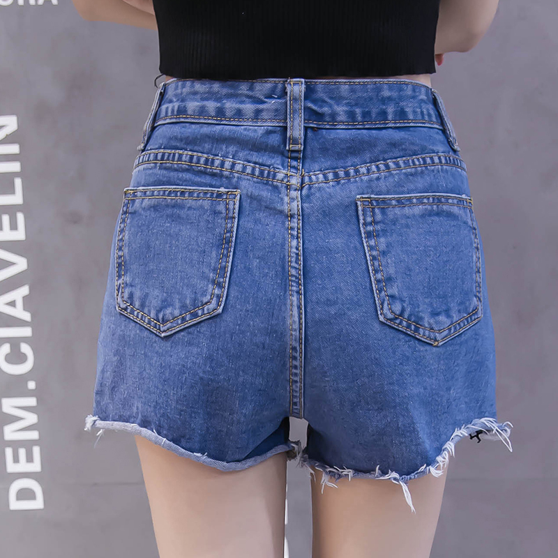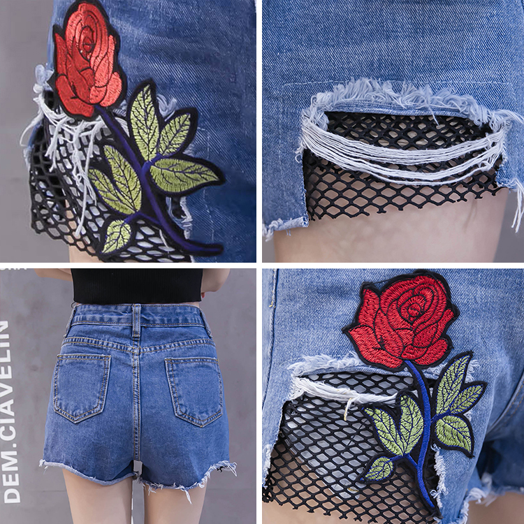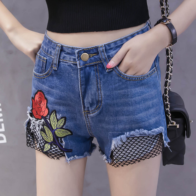 / 夏季韓版高腰刺繡牛仔短褲女破洞毛邊闊腿褲百搭花朵毛邊熱褲