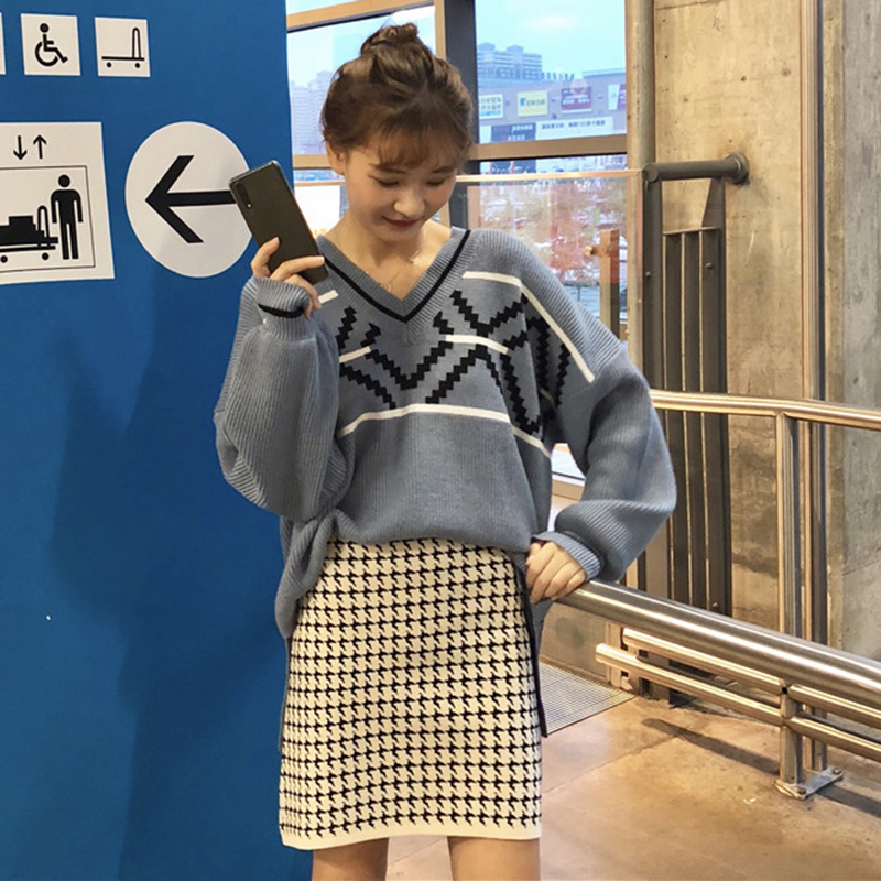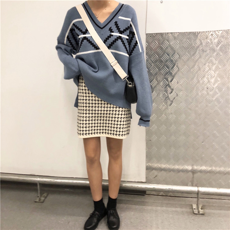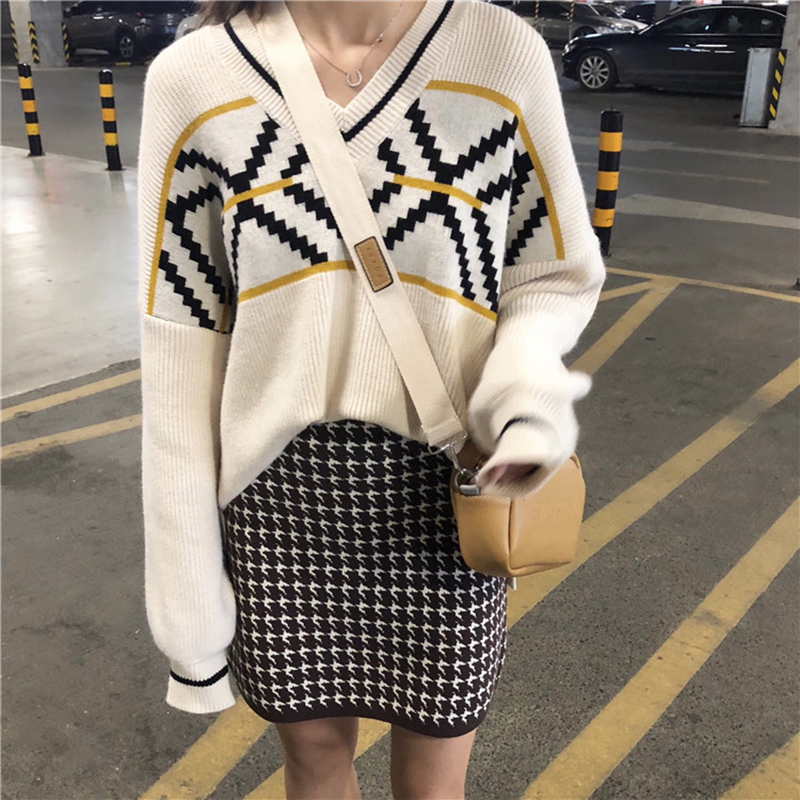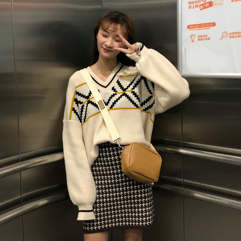 慵懶風V領套頭菱格毛衣女裝秋冬2018新款韓版寬松長袖針織外套潮