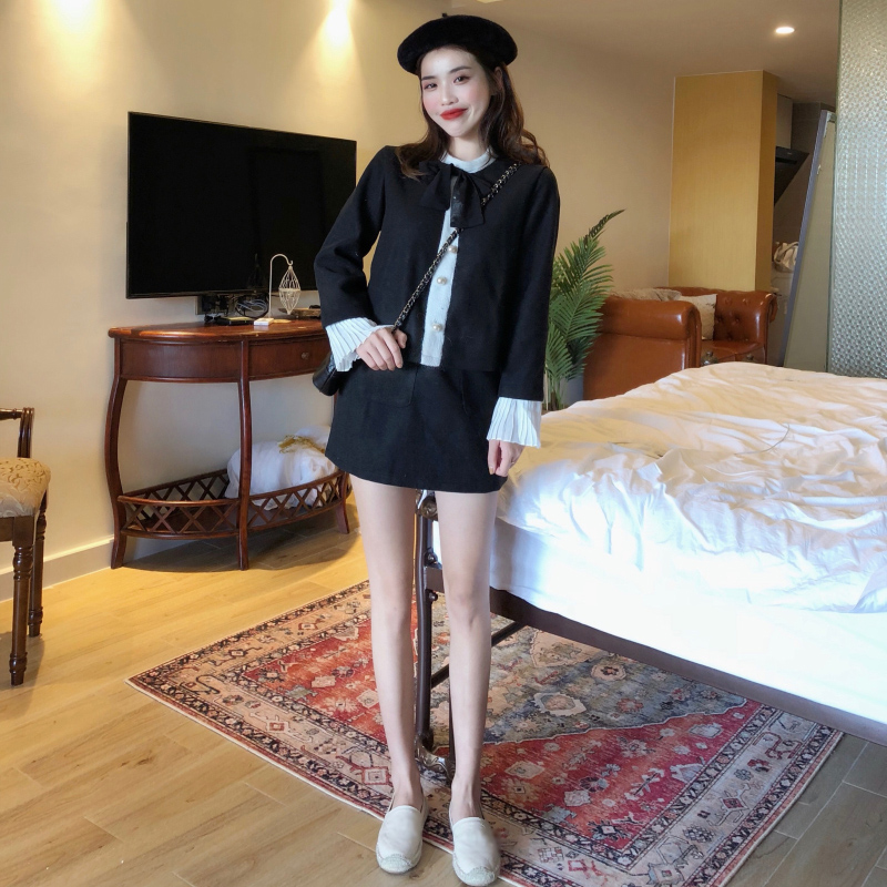 / 韓國秋冬復古名媛小香風喇叭袖拼接毛呢上衣高腰半身裙時尚套裝女