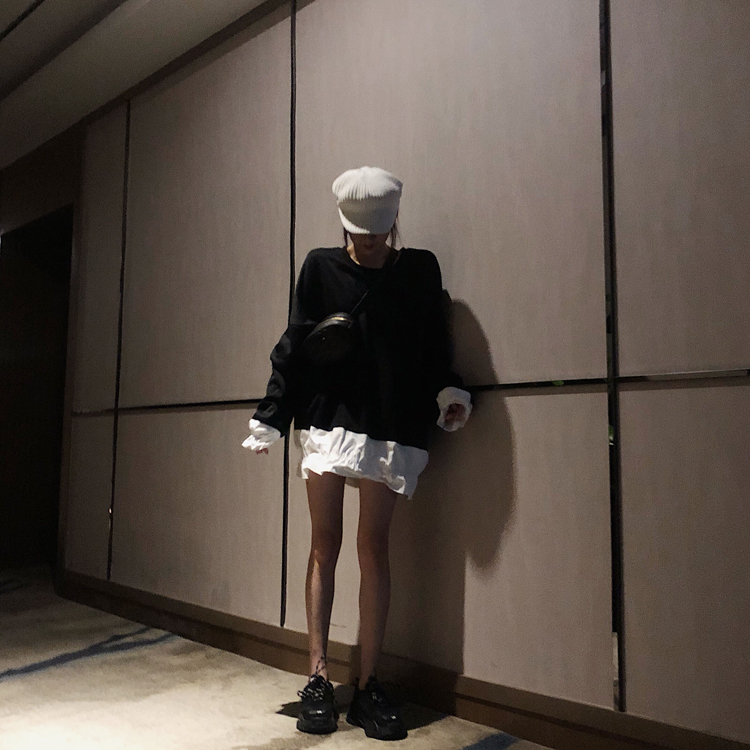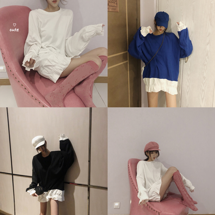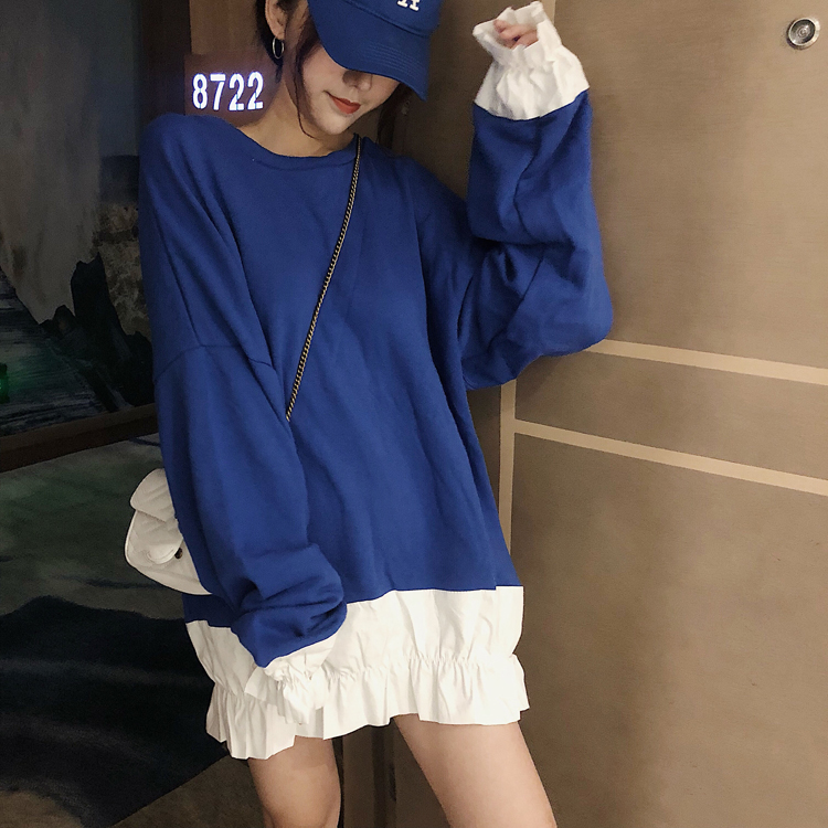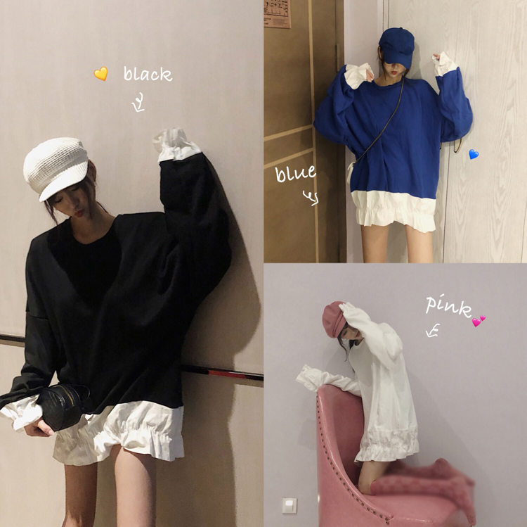 / 秋季新款韓版小清新百搭寬松顯瘦中長款撞色拼接魚尾衛衣連衣裙女