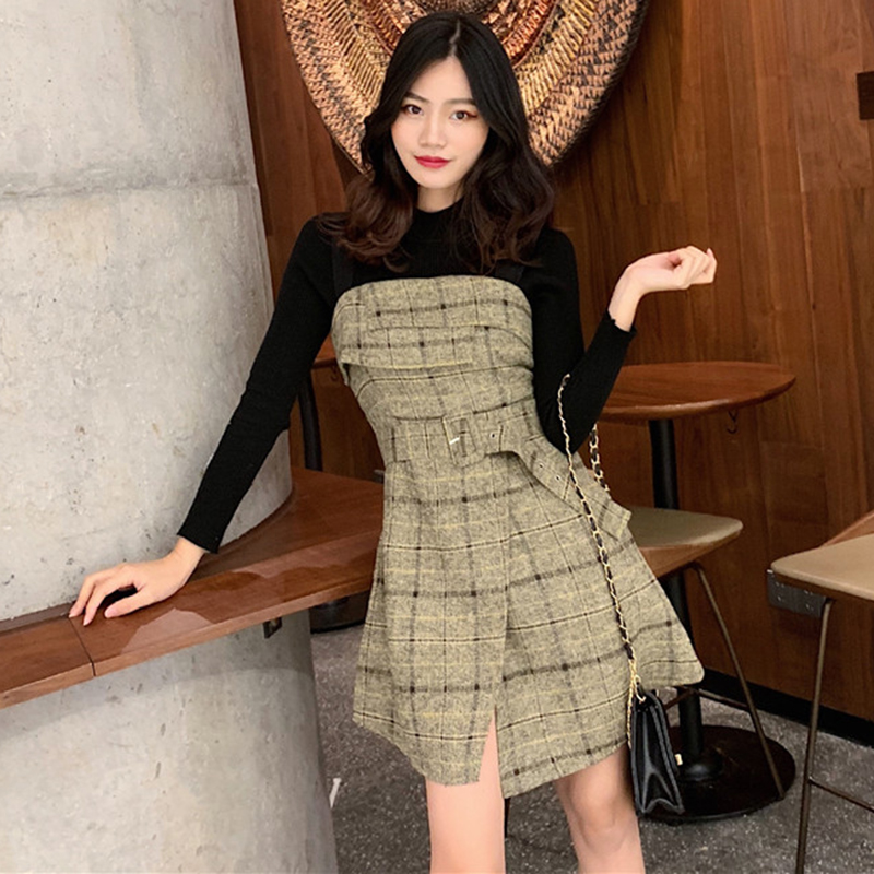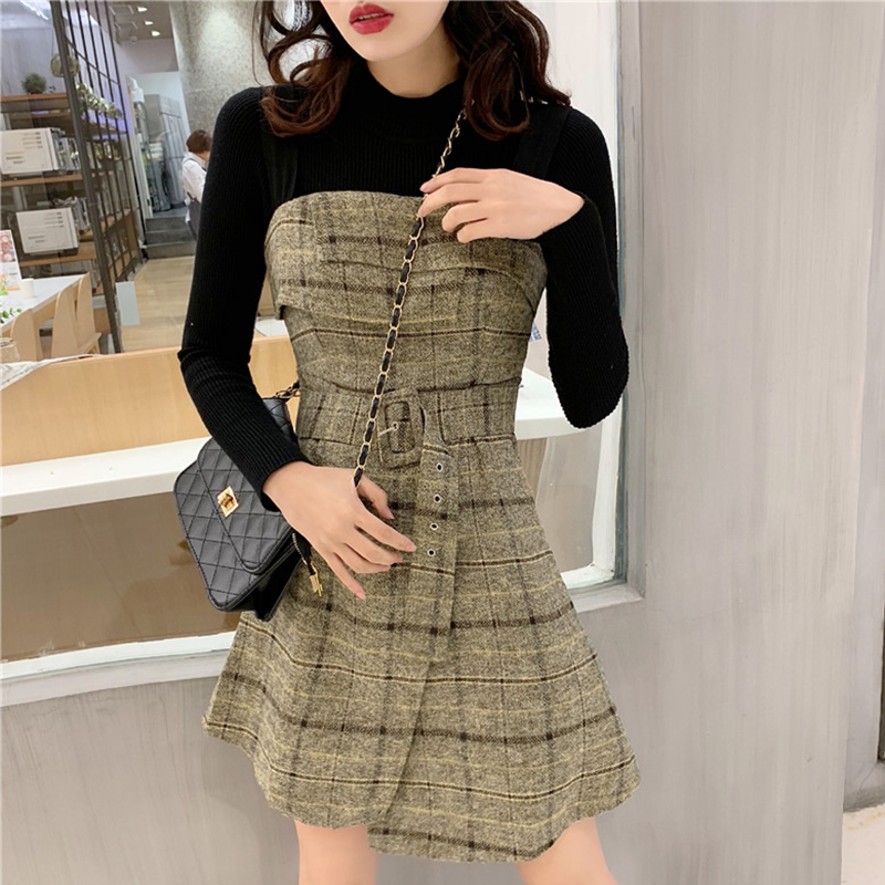御姐套裝女秋冬新款顯瘦格子A字吊帶連衣裙黑色半高領針織打底衫