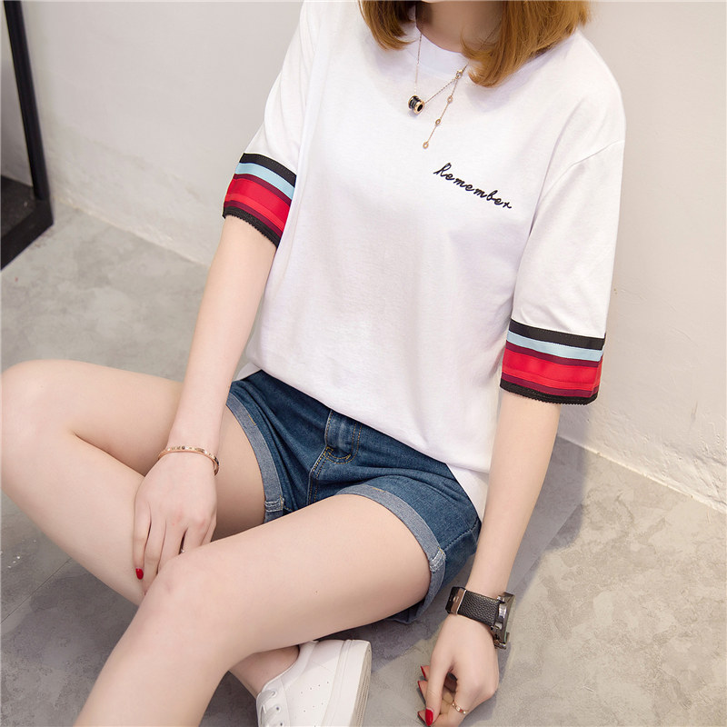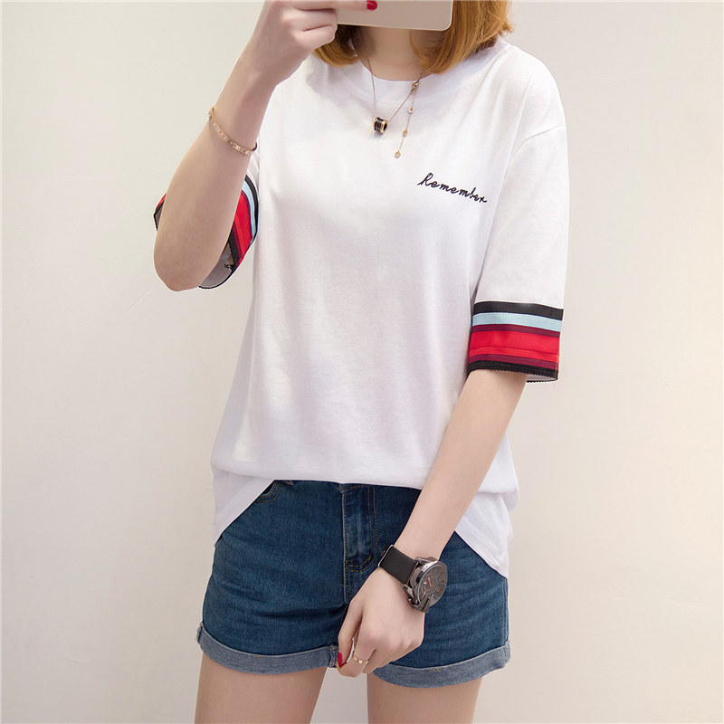 / 短袖上衣女夏新款條紋白色t恤女拼色短袖韓版字母打底衫百搭