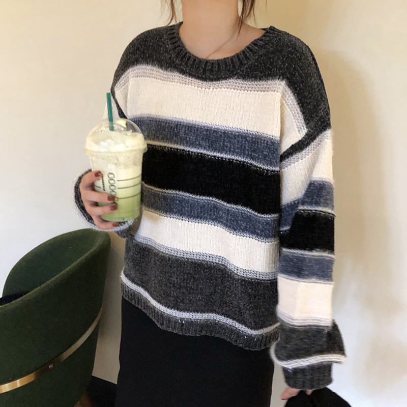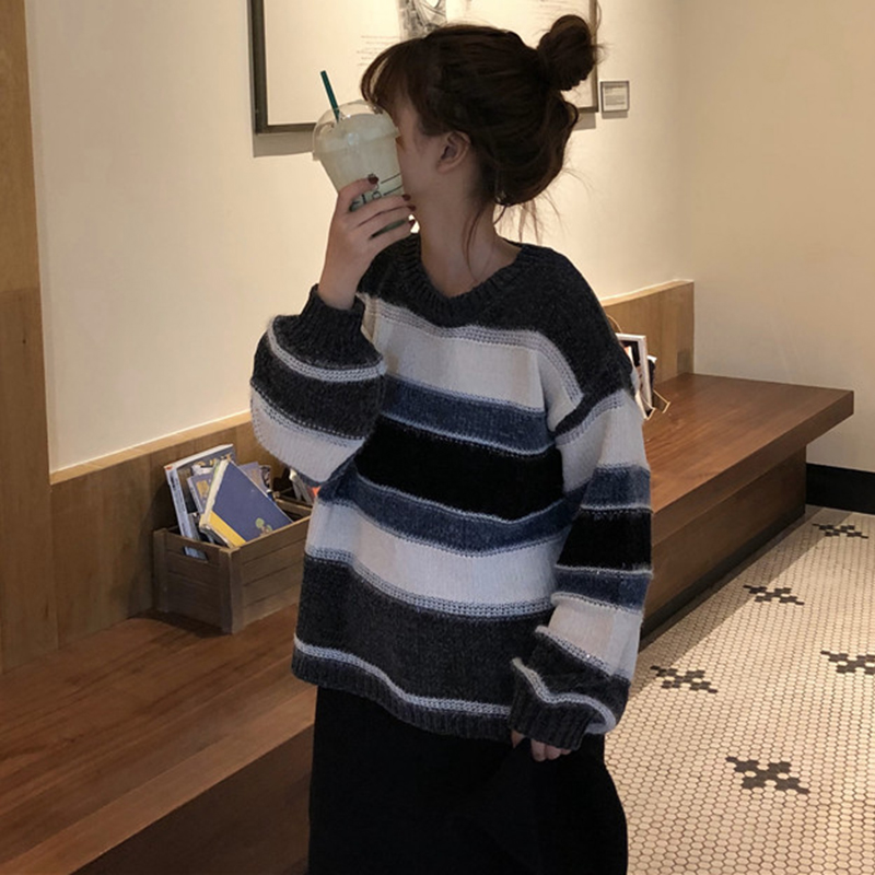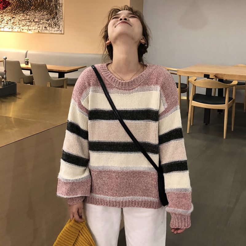 女秋裝2018新款韓版清新拼色條紋圓領短毛衣學生慵懶寬松長袖上衣
