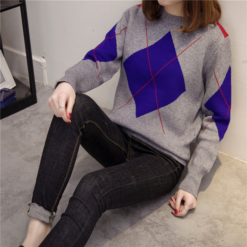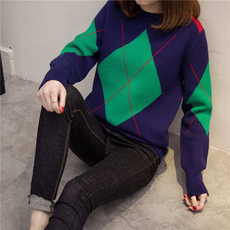 / 拼色短款毛衣女套頭寬松長袖針織衫秋冬季打底衫拼色加厚上衣外套